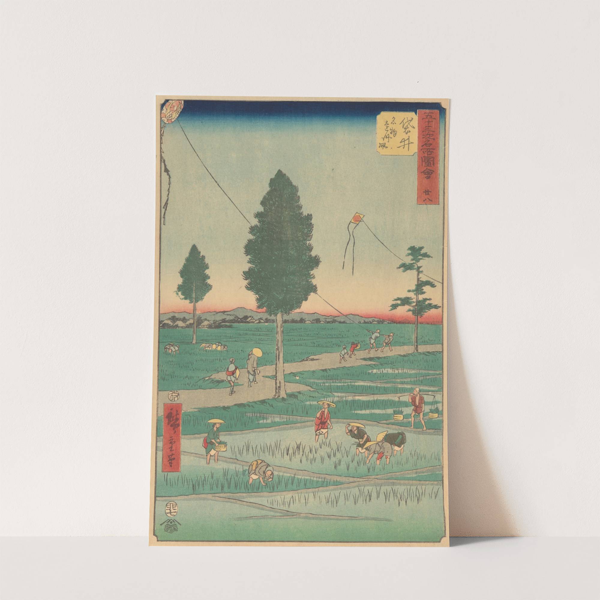 Discover the serene beauty of traditional Japanese art with "Fukuroi" by Andō Hiroshige. This exquisite woodblock print showcases a tranquil rural scene during sunset, featuring lush green fields and gently rolling hills in the background. A tall pine tree stands...