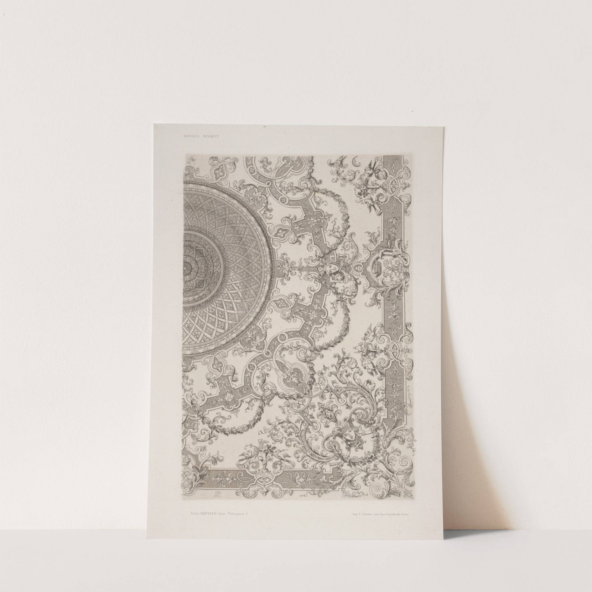 This intricately detailed monochrome illustration features an elaborate ceiling design, reminiscent of Baroque or Rococo styles. The artwork is richly adorned with swirling floral patterns, leafy vines, and intricate geometric motifs. Central to the composition is a large circular medallion...
