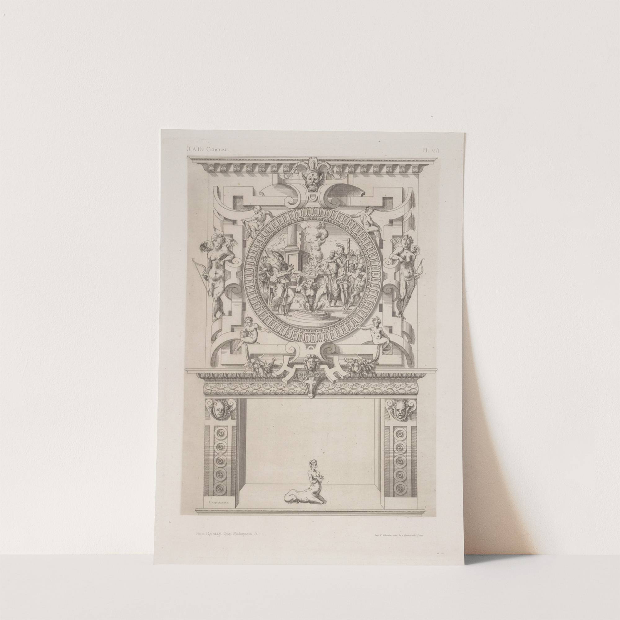 This exquisite art print features a detailed drawing in a classic Baroque style by the renowned artist André-Charles Boulle. The composition is centered around a circular relief carving encasing a busy scene filled with intricate carvings of figures and architectural...