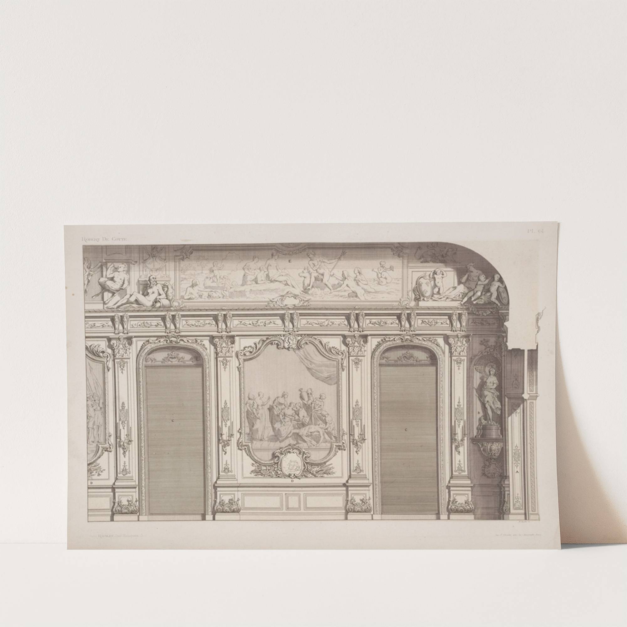 This elegant wall panel features intricate baroque-style carvings and detailed relief work, inspired by the classical artistry of André-Charles Boulle. The central portion showcases a finely etched scene depicting several figures in lively interaction, surrounded by elaborate floral motifs and...