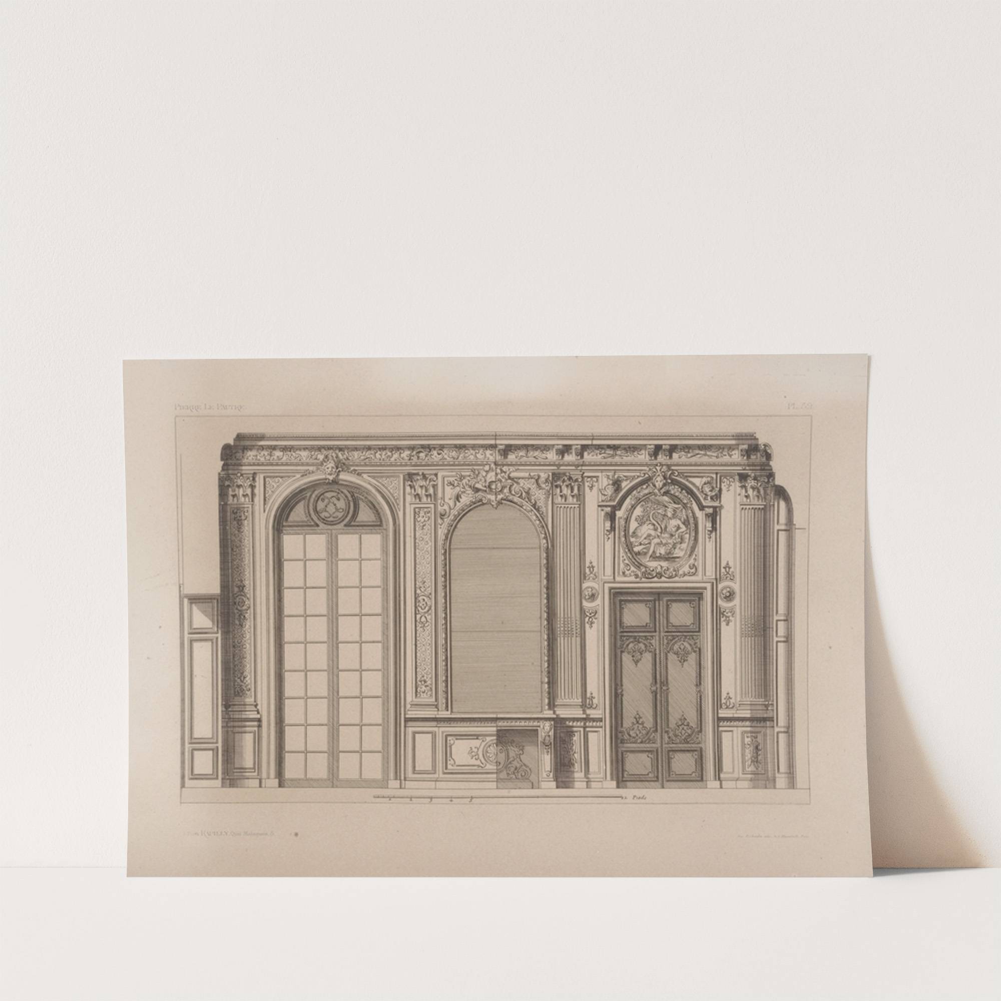 This intricately detailed architectural drawing showcases a classical European façade in black ink on white paper. The design features three distinct archways: a grand central arch flanked by two smaller ones, each adorned with exquisite baroque-style carvings and ornate details....