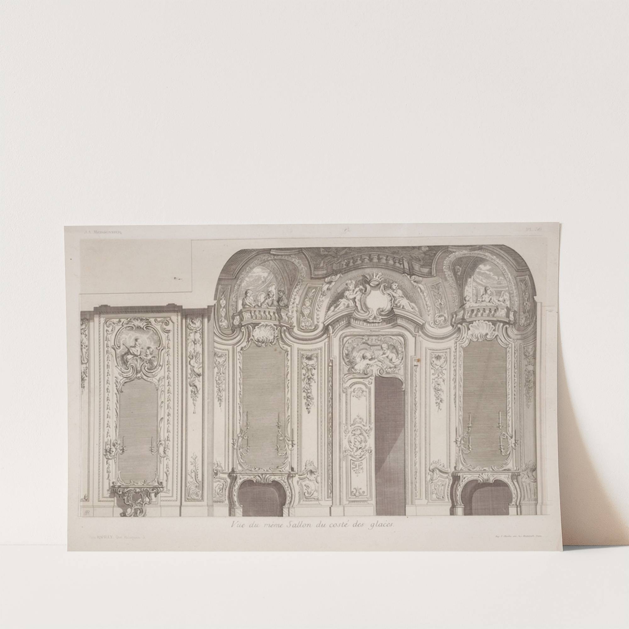 This exquisite print showcases "Vue du même salon du côté des glaces" by André-Charles Boulle, an intricate architectural drawing of an opulent Baroque interior. The black-and-white illustration features highly detailed embellishments and ornate carvings typical of the period. Prominent in...