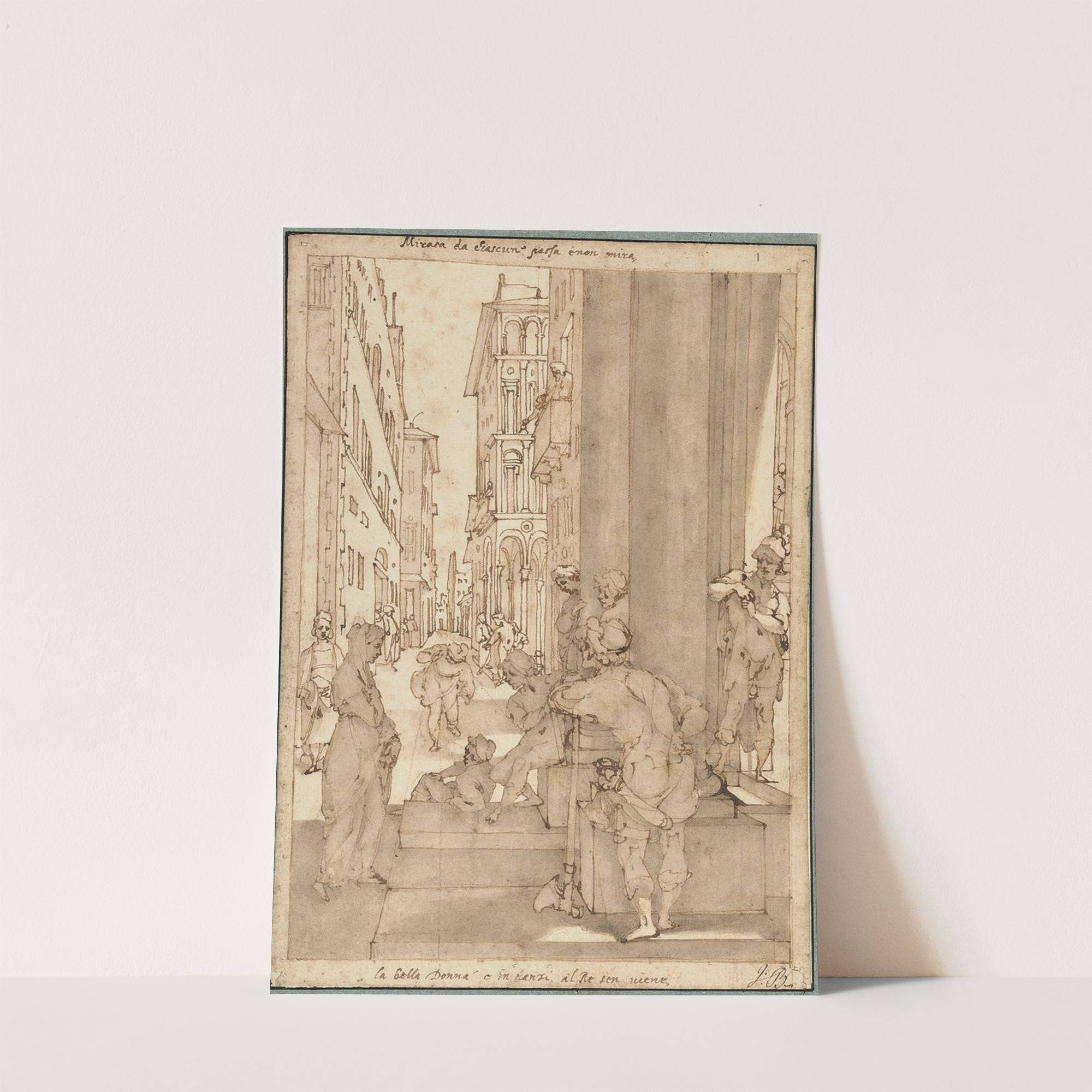 This exquisite art print features "Sophronia Enters the Palace of Aladdin" by Andrea Boscoli, rendered in delicate sepia tones that evoke a timeless elegance. The composition captures a bustling street scene with intricate architectural details. In the foreground, Sophronia is...