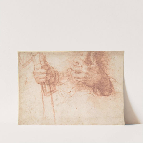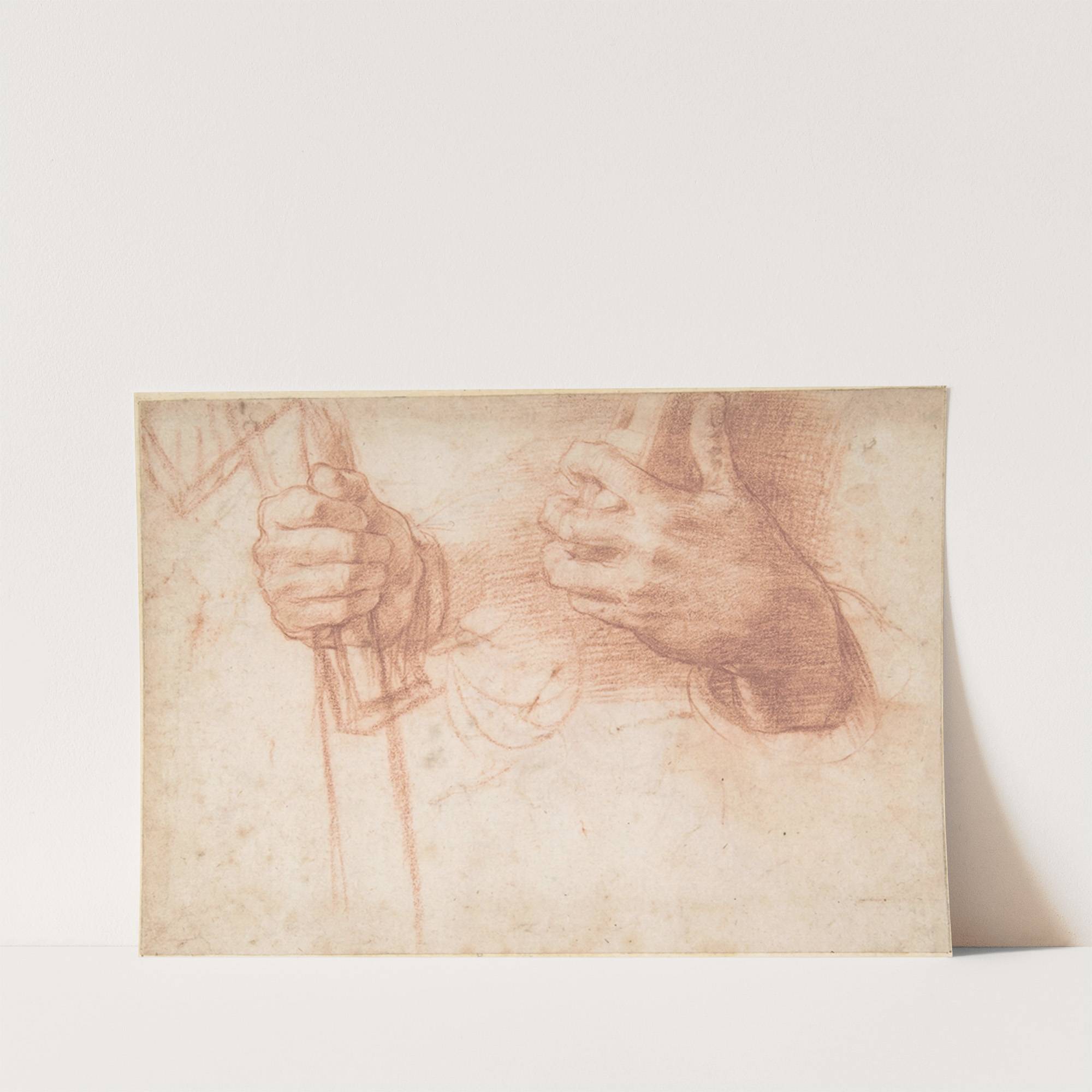 This monochromatic art print features two intricately drawn hands in a sketch-style portrayal titled "Studies of Hands" by Andrea del Sarto. The image is rendered in soft, sepia-toned pencil sketches that capture the subtle texture and shading on the paper....