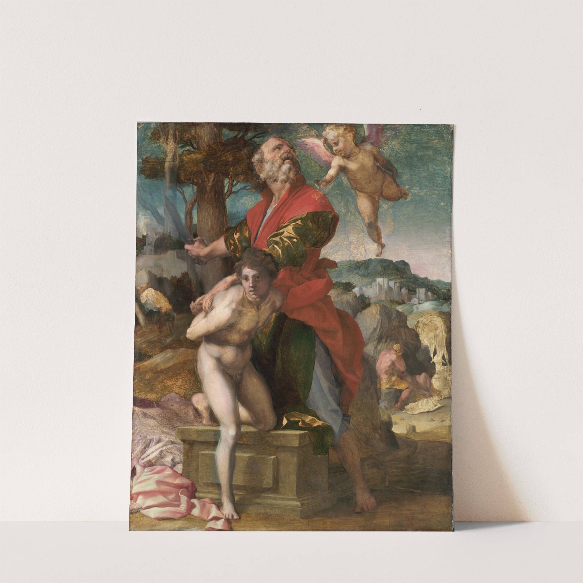 This captivating artwork titled "The Sacrifice of Isaac" by Andrea del Sarto showcases an intricate biblical scene rich in detail and color. At the center, a bearded man with a solemn expression stands with his right arm extended, holding a...