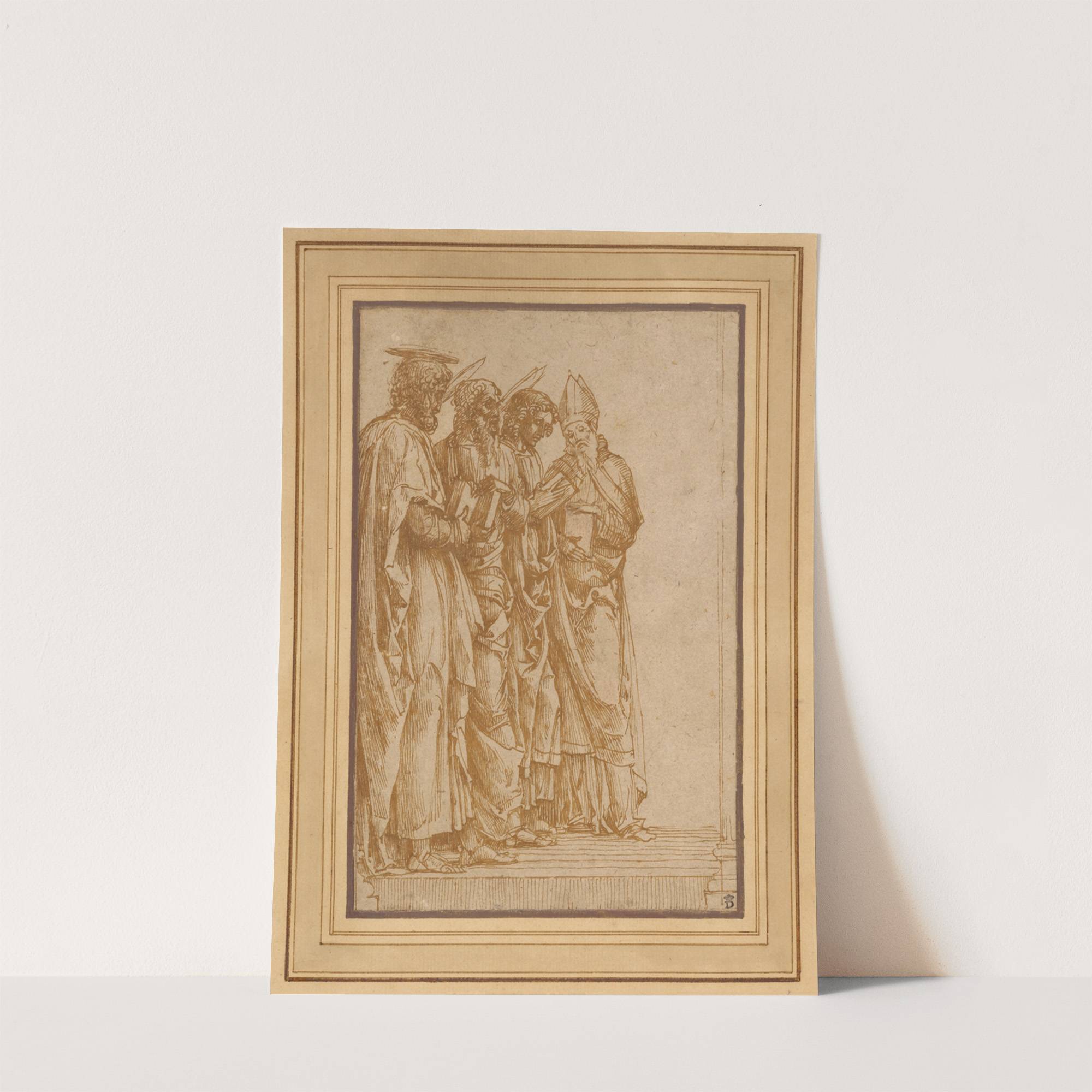 This art print features "Study of Four Saints" by renowned artist Andrea Mantegna, rendered in delicate sepia tones. The composition showcases four saints standing in a vertical row, each dressed in flowing robes that cascade to the ground. Their garments...