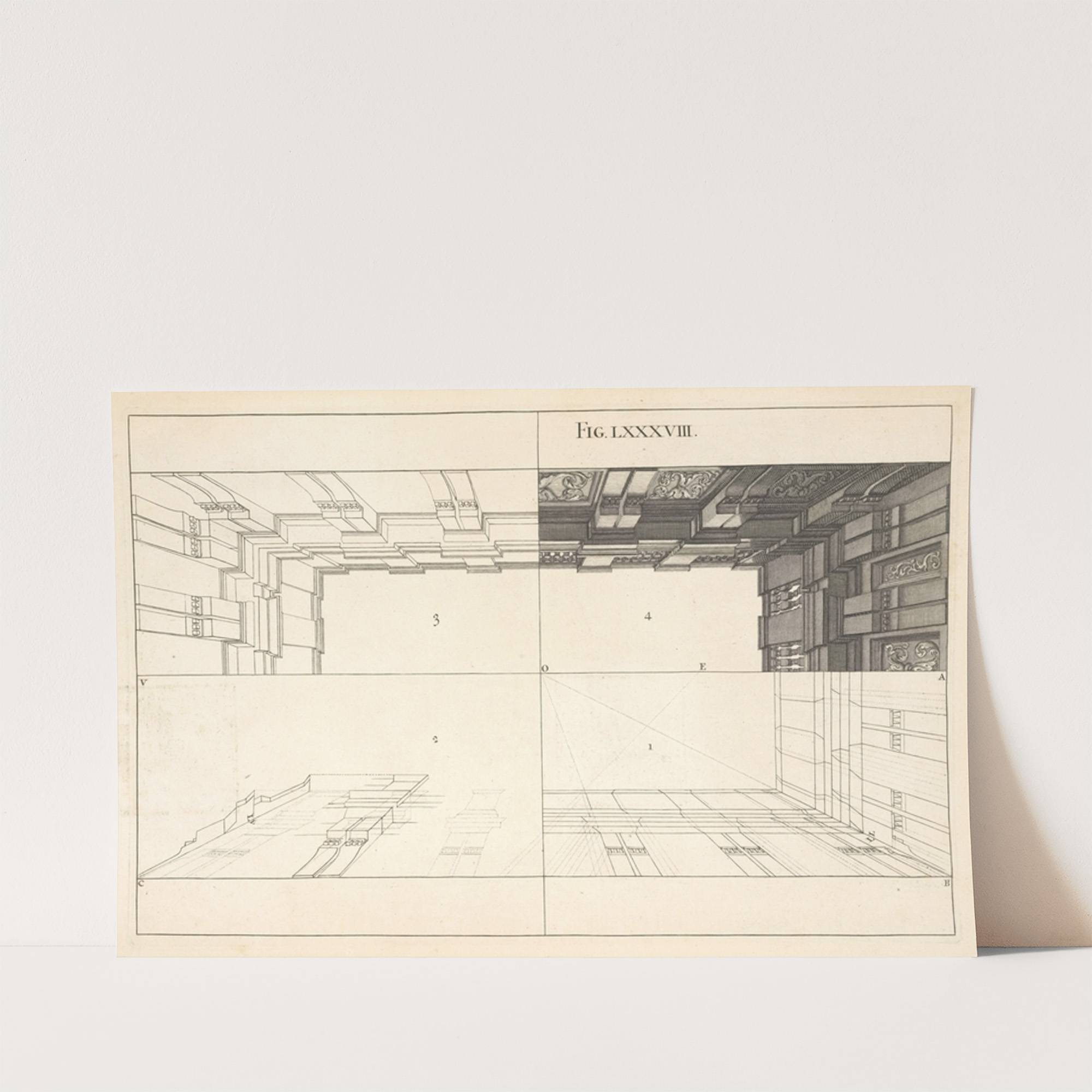 This black and white architectural drawing titled "The Façade" by Andrea Pozzo showcases an intricate perspective of a grandiose building's exterior. The artwork is composed of four quadrants, each displaying detailed line work that captures the complexity of classical architecture....