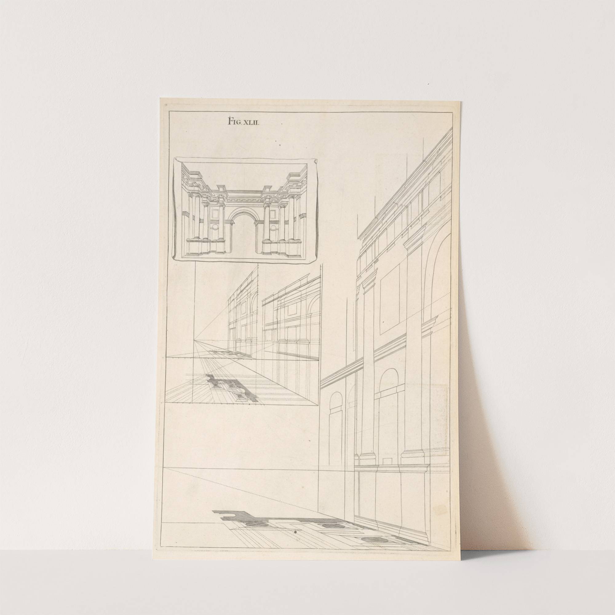 This art print is an elegant sketch of architectural details created by the artist Andrea Pozzo, capturing a sense of classical elegance and urban sophistication. The monochromatic line drawing features intricate details of a historic building entrance. In the upper...