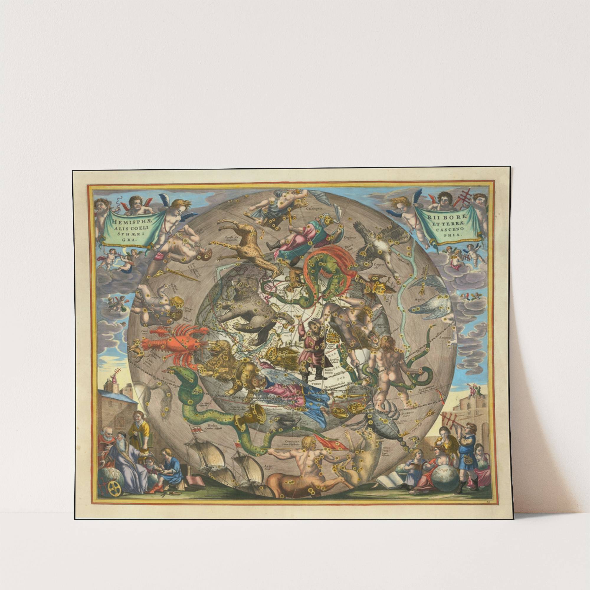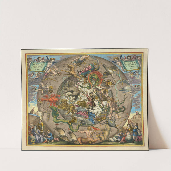 Experience the vibrant artistic mastery of Andreas Cellarius with "Hemisphaerii Borealis Coeli et Terrae Sphærica Scenographia," a richly detailed print depicting an intricate celestial and terrestrial scene. This mesmerizing artwork is a kaleidoscope of colors, featuring a central circular stone...