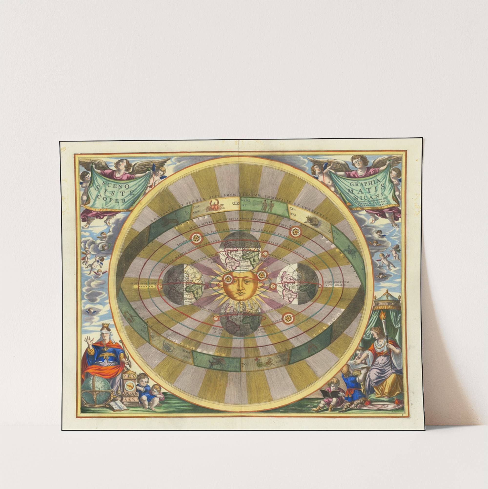 This art print features "Scenographia Systematis Copernicani" by Andreas Cellarius, showcasing an intricate celestial illustration that captures the harmony of Renaissance astronomy and mythology. The central focus is a large, circular sun with a serene face, radiating golden light. Surrounding...