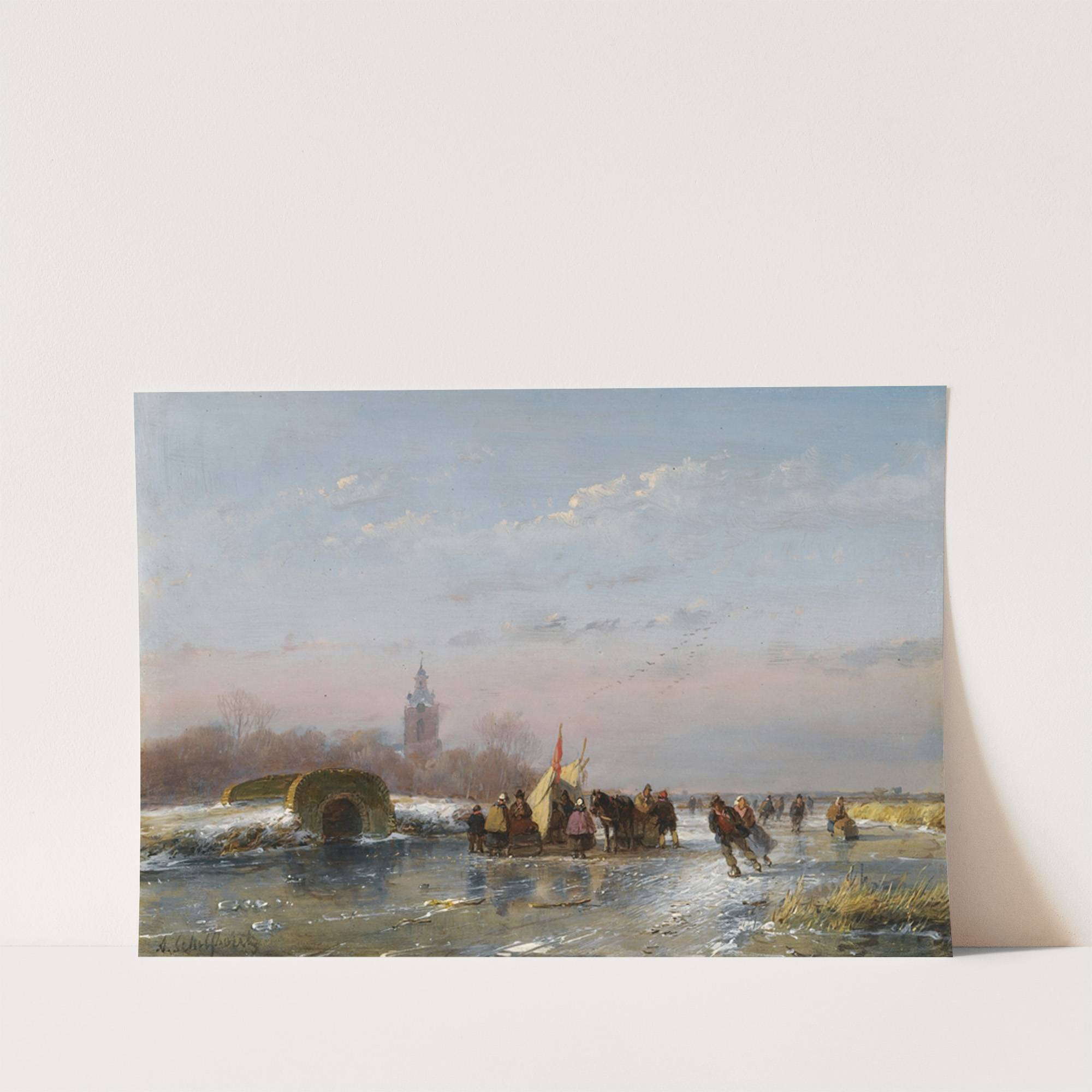 Discover the tranquil charm of "A Frozen Waterway with Skaters by a Refreshment Stall" by Andreas Schelfhout. This captivating painting depicts a serene winter scene where skaters glide along an icy waterway, surrounded by gently reflecting trees and soft, pastel-colored...