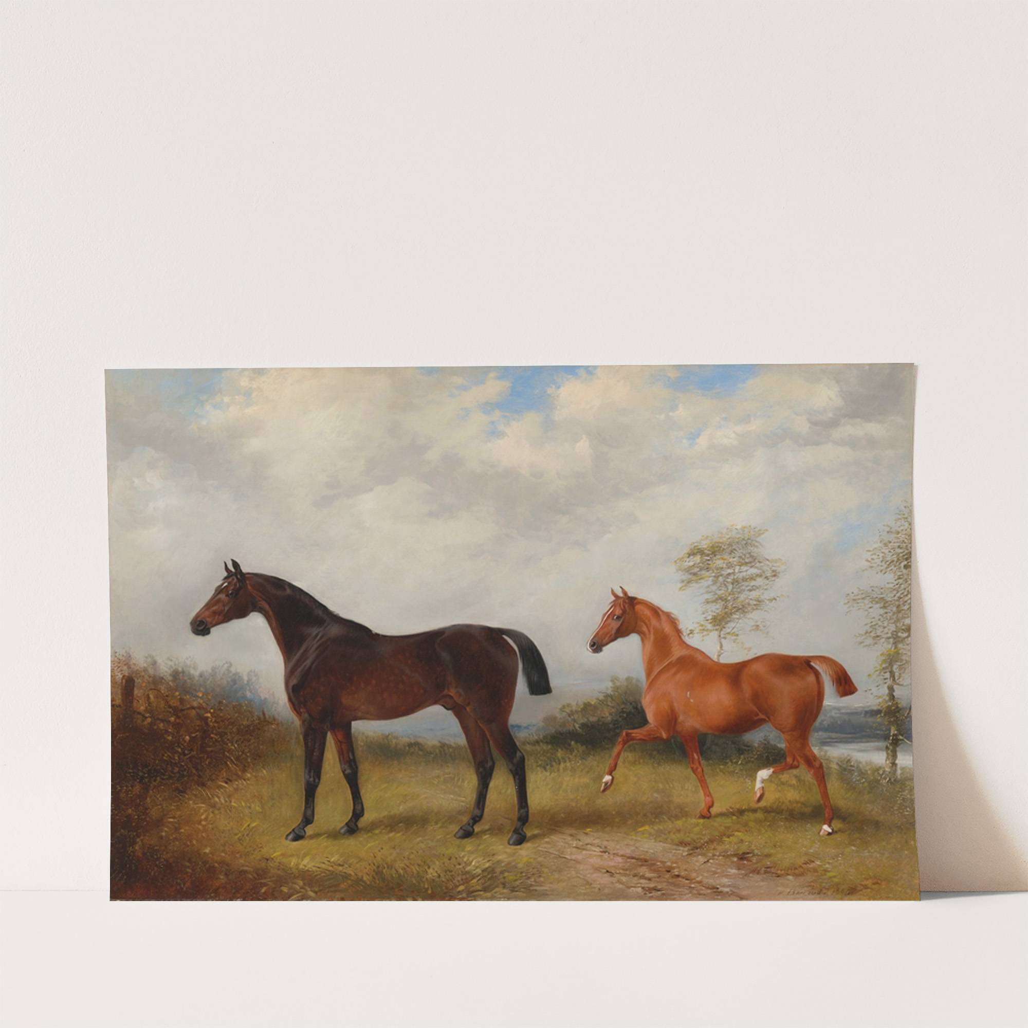 A bay and a chestnut hunter in a wooded landscape (1860) by Henry Barraud - Wall Art Print