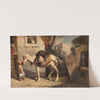 This charming painting, "A Horse with Child Holding Reins" by Alexandre-Gabriel Decamps, depicts a rustic rural scene bathed in warm sunlight. The focal point is a white horse with dark patches, standing calmly near a weathered stone building. A young...