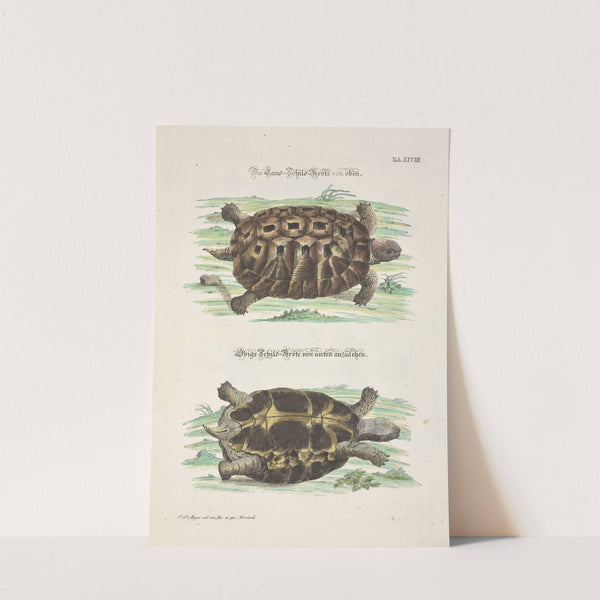 This charming art print showcases two beautifully illustrated turtles against a white background with subtle green grass-like accents. The top turtle, labeled "Die Kriech-Schildkroete," displays intricate shell patterns with dark brown and black tones, featuring large, symmetrical squares and hexagons....