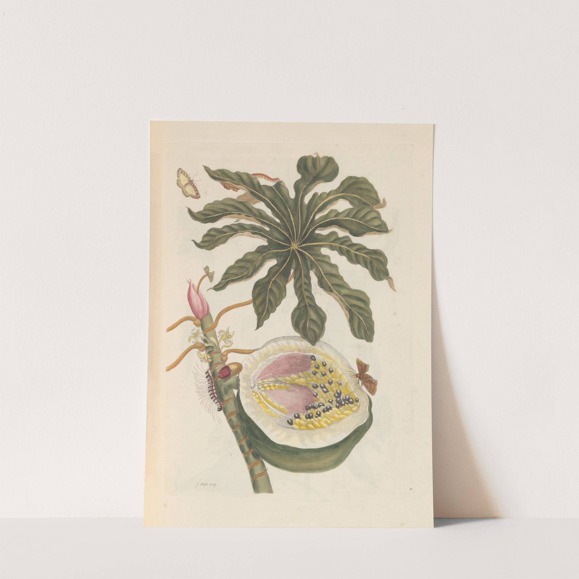 This exquisite botanical illustration showcases the intricate details of tropical plant life with meticulous precision. At the center is a large, open tropical fruit with a white outer skin and vibrant pink interior, adorned with small yellow and purple speckles,...