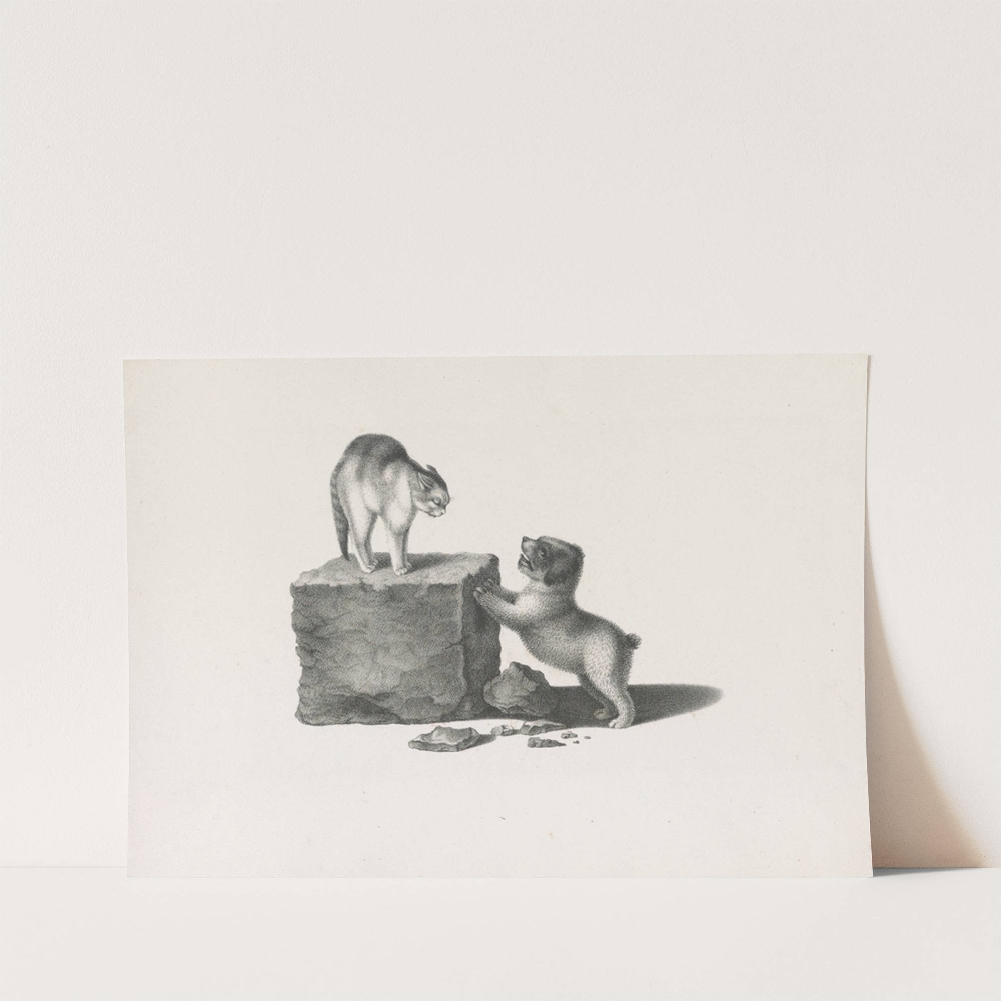Domestic cat standing on a block and a puppy with its front paws on the block (1820-1860) by Gottfried Mind - Wall Art Print