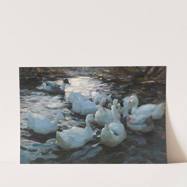 This striking art print captures the serene beauty of a group of white ducks gathered in a reflective pond, titled "Elf Enten im Wasser" by Alexander Koester. The image is rendered with impressionist brushstrokes, giving it an ethereal, dreamlike quality....