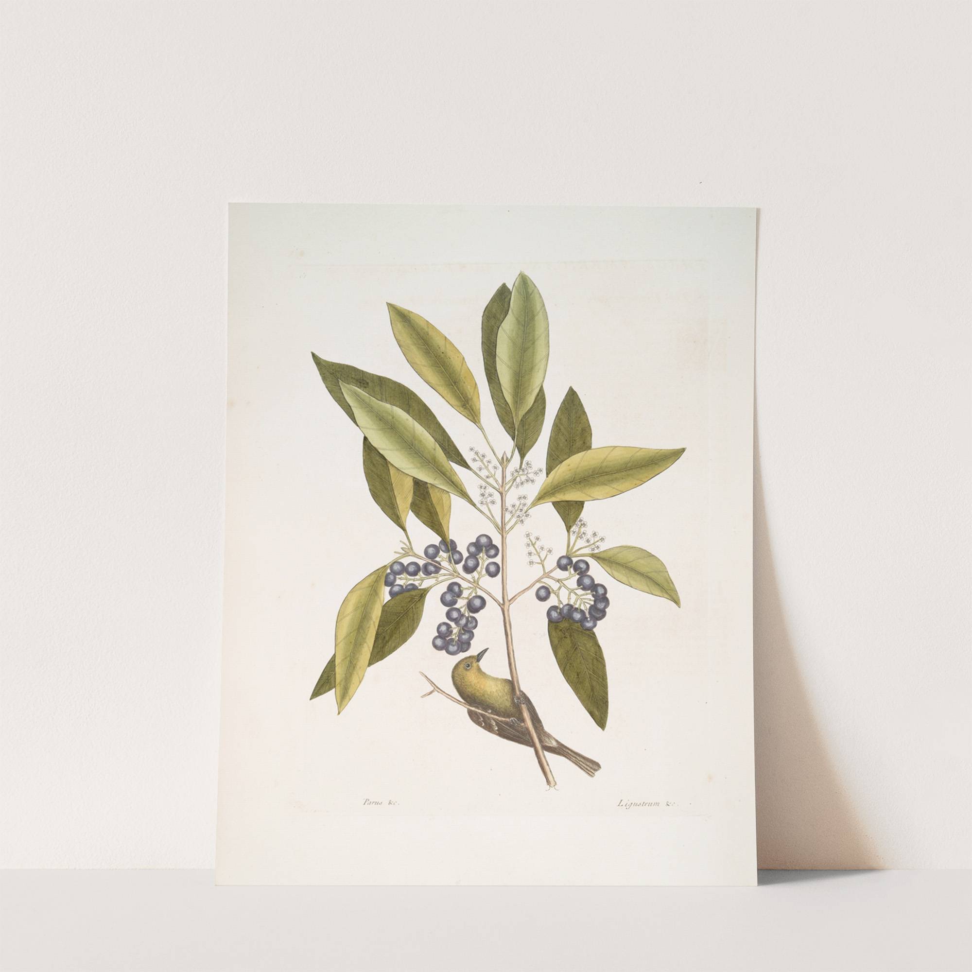 Parus Americanus lutescens, The Pine-creeper; Ligustrum Lauri folio, The puple-berried Bay. by Mark Catesby - Wall Art Print