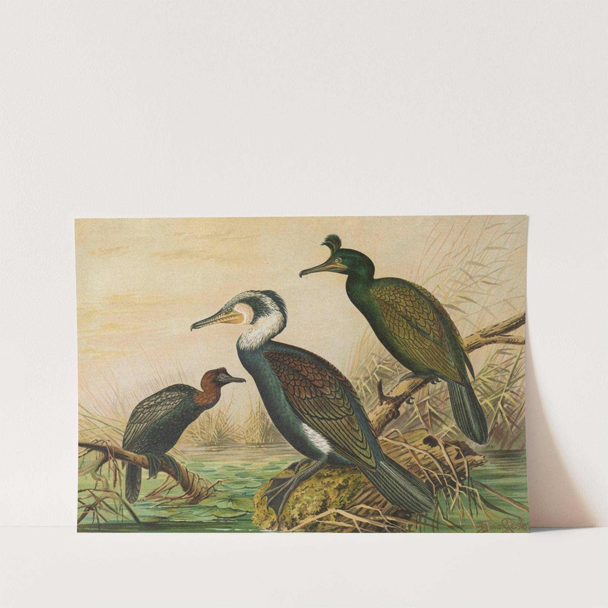 This art print showcases a beautifully detailed illustration of three cormorants in their natural habitat, created by the renowned artist Johann Friedrich Naumann. The composition features three distinct species: from left to right, a small cormorant with dark feathers and...