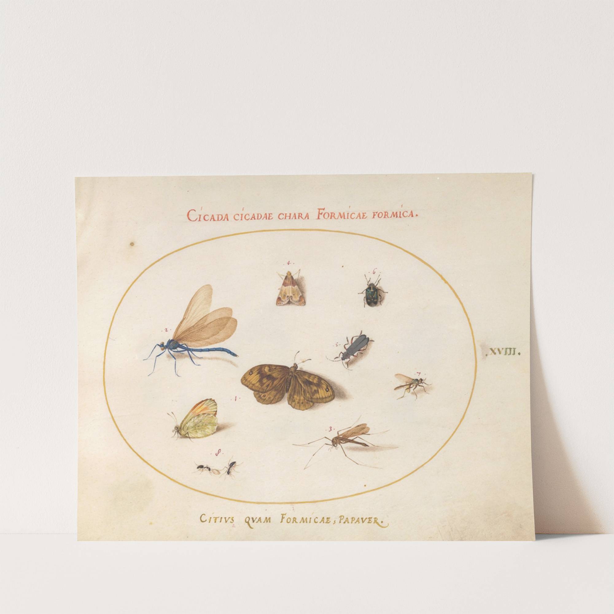 Plate 18; Two Butterflies and a Moth with a Damselfly, Two Ants, and Four Other Insects (1575-1590) by Joris Hoefnagel - Wall Art Print