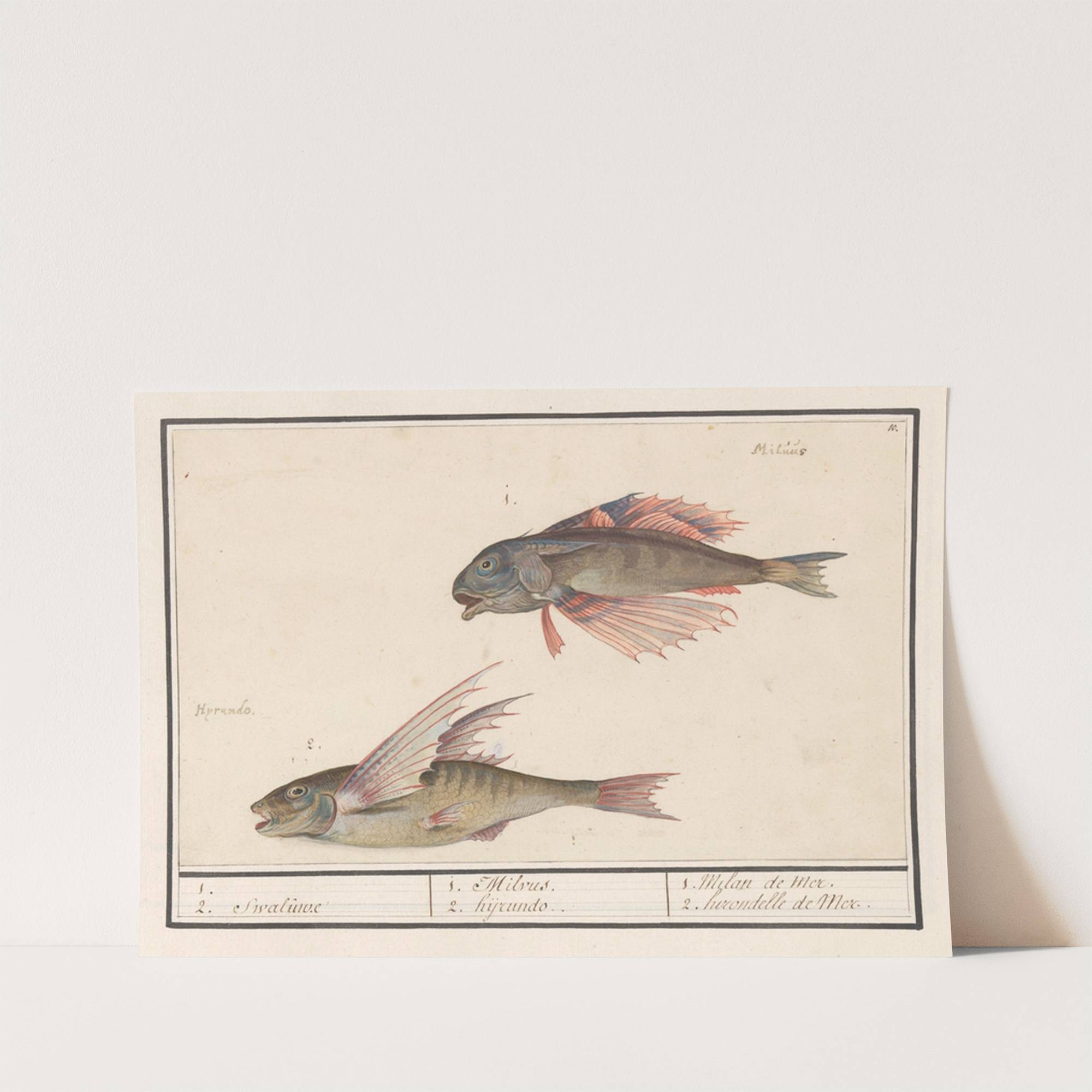Rode poon (Chelidonichthys lucerna) en vliegende vis (Exocoetidae) 1. 2. Swaluwe 1. Milvus 2. hyrundo. (1596-1610) by Anselmus Boëtius de Boodt - Wall Art Print