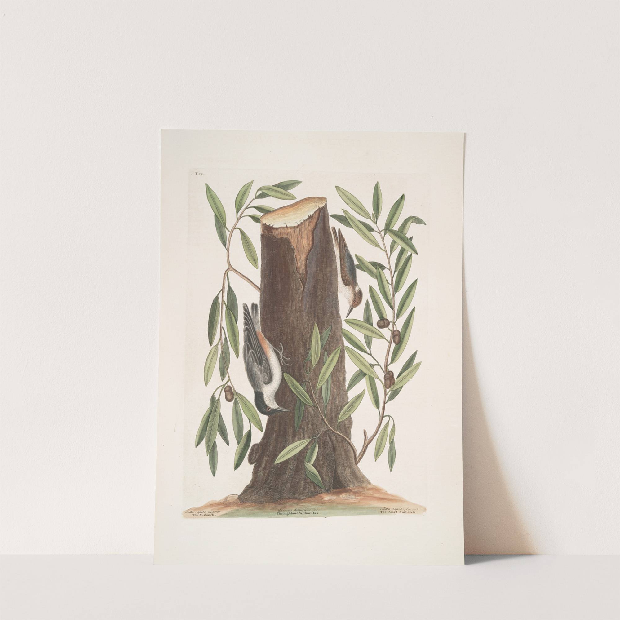 Sitta capite nigro, The Nuthatch; Luercus humilior, The Highland Willow Oak; Sitta capite fusco, The Small Nuthatch. by Mark Catesby  - Wall Art Print