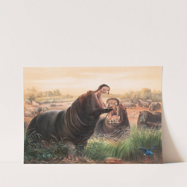 This vibrant illustration depicts two massive hippopotamuses in a dynamic interaction within their natural habitat. Rendered with meticulous attention to detail and rich color, the larger hippo on the left is standing upright, displaying its impressive open mouth filled with...