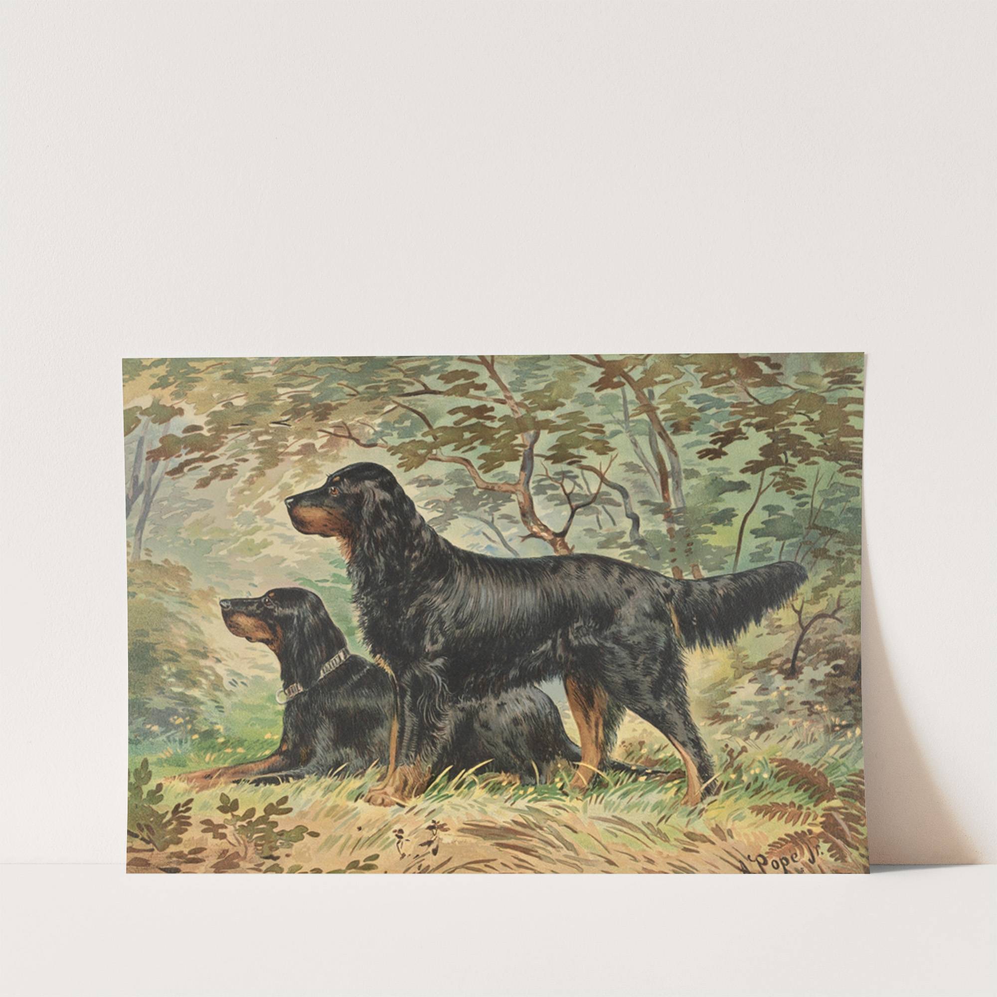 This charming art print features two majestic black Gordon Setters in a lush forest setting. The larger dog stands proudly to the right, its shiny black coat reflecting the soft sunlight filtering through the trees. Its attentive gaze and alert...