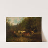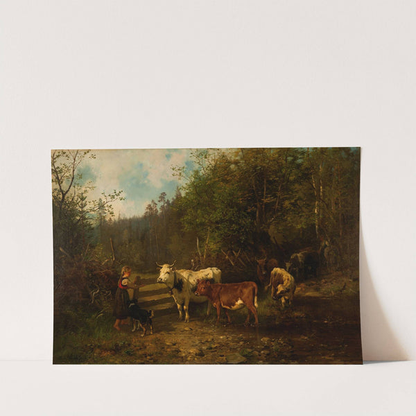 "Woodland Pasture" is a captivating painting by Anders Askevold that brings the tranquility of rural life to life. The scene features a pastoral landscape where five cows, each with unique markings and hues, stand at ease in a sunlit forest...