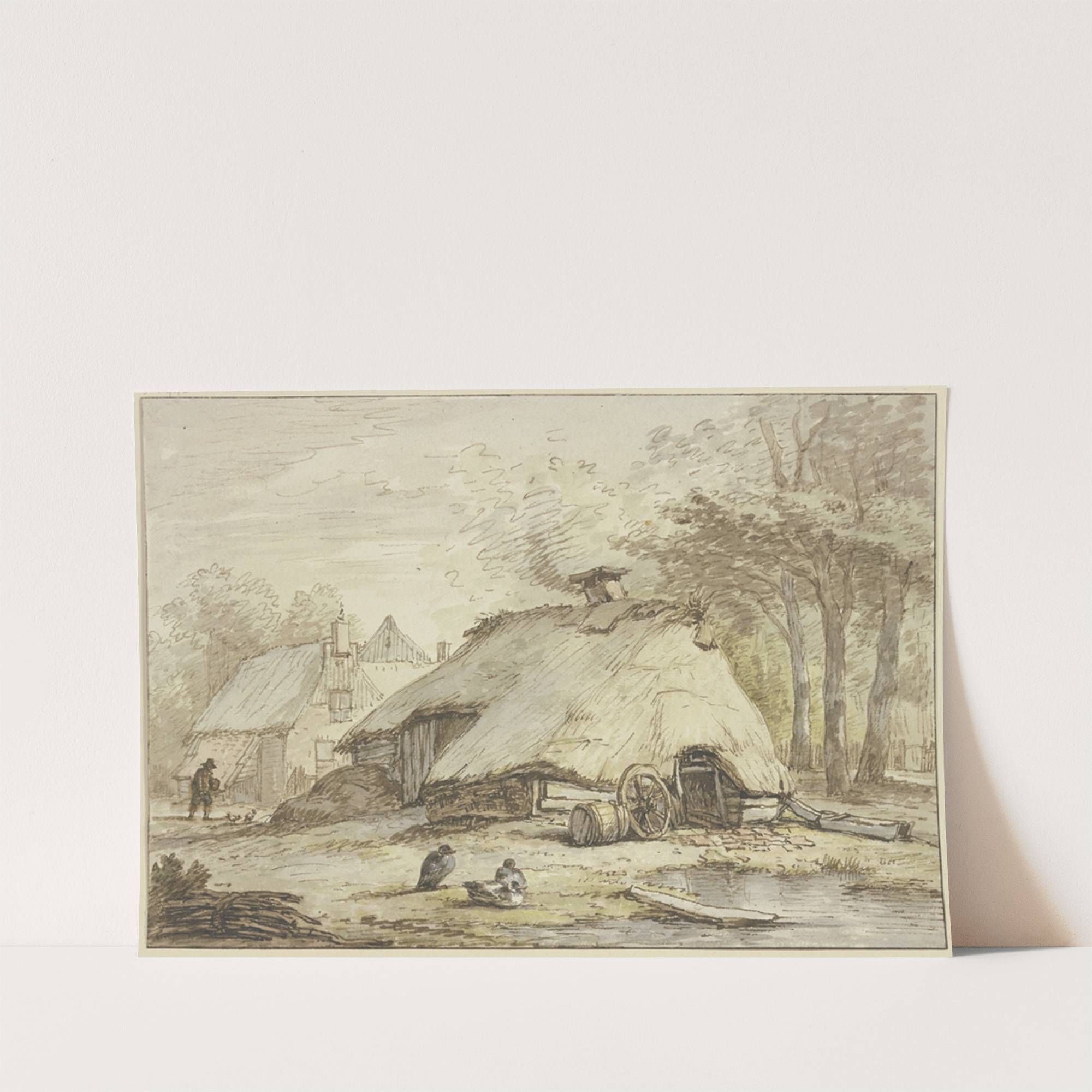 Drei Hütten unter Bäumen, im Vordergrund drei sitzende Enten by Anthonie van Borssom - Wall Art Print