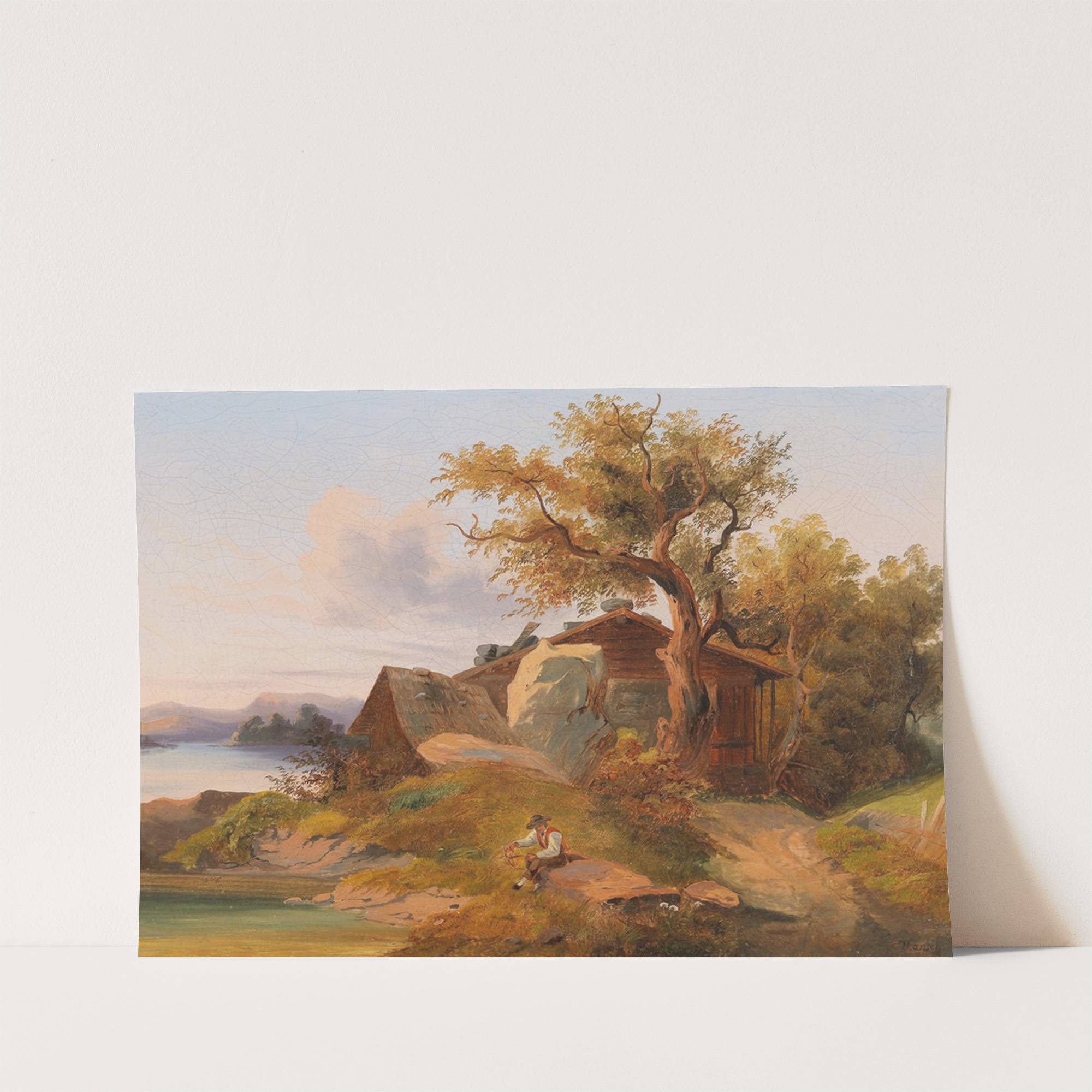 This artwork, "Resting By The Brookside" by Anton Hansch, beautifully captures the tranquil essence of nature in a classic realist style. A solitary figure sits on a rocky outcrop, leaning back against a large tree with sprawling branches and golden...