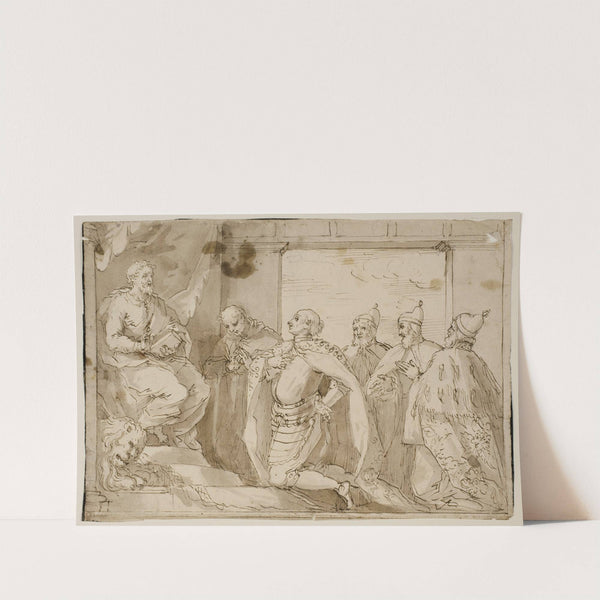 En kriger med brystpanser, en kappeklædt mand og tre doger knælende for den tronende Skt Markus by Antonio Aliense - Wall Art Print
