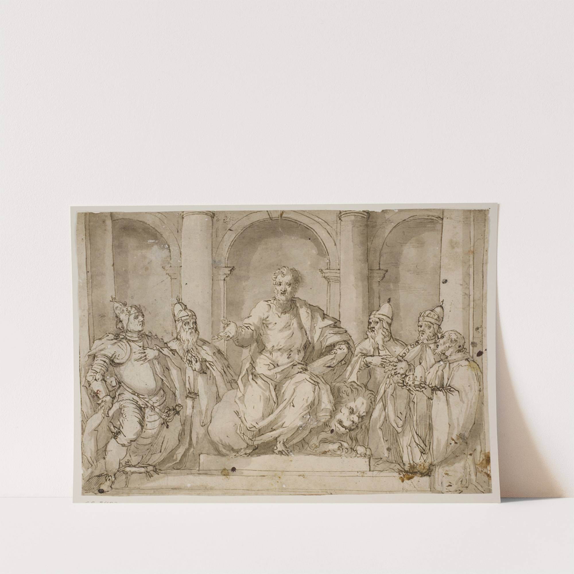 Skt Markus siddende på en trone, omgivet af fire doger og en mand med en dogehat i hænderne by Antonio Aliense - Wall Art Print