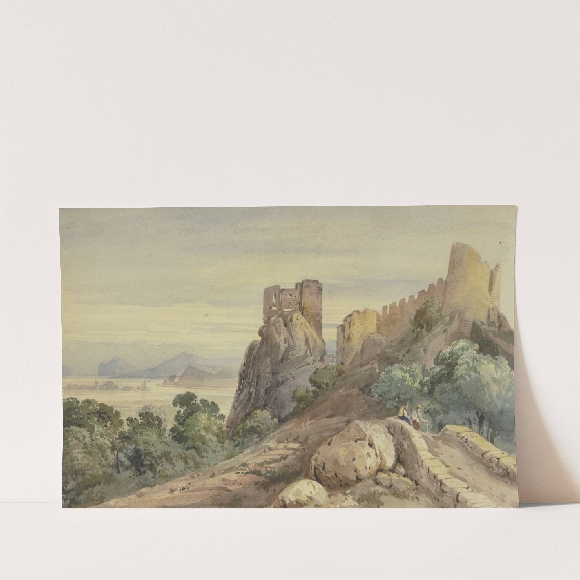Burgruine, vorn auf einer Brücke zwei Männer by Jean-Joseph-Bonaventure Laurens - Wall Art Print