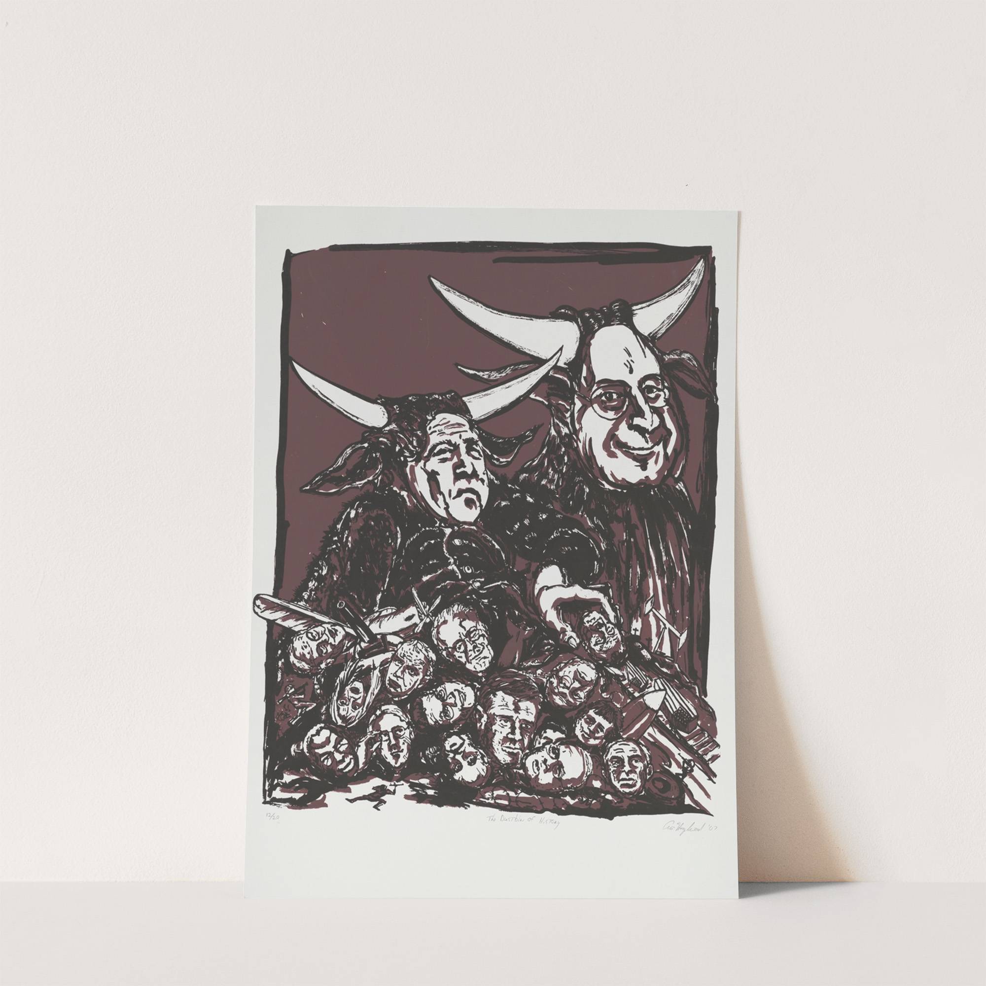 This striking print by artist Art Hazelwood titled "The Dustbin of History" features a powerful monochromatic scene rendered in deep black and white against a rich maroon background. Dominating the composition are two prominent figures: one with large, curved horns...