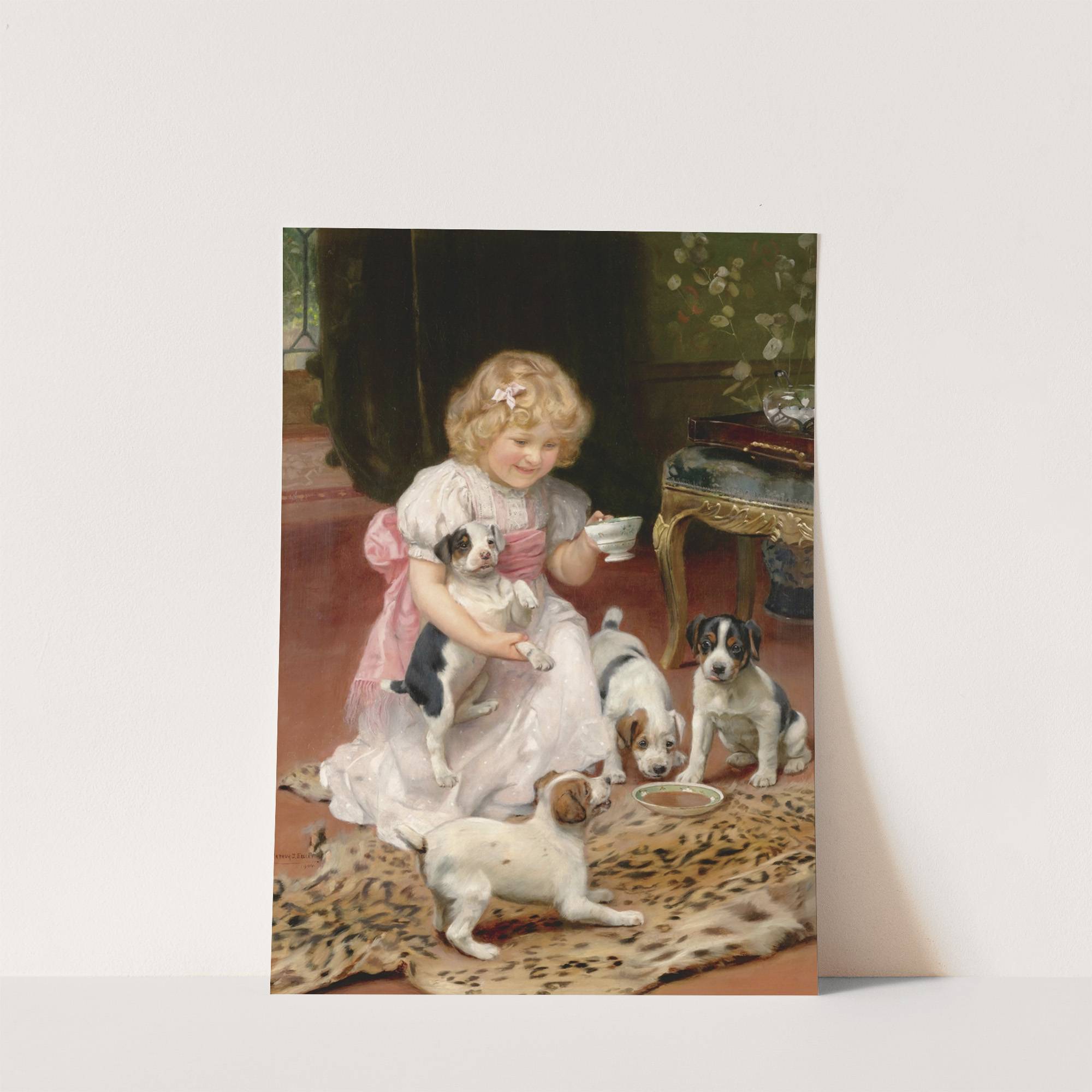 This charming art print features "Too Hot" by Arthur John Elsley, beautifully capturing an endearing moment of a little girl and her four playful dogs. The young girl, with curly blonde hair adorned with a pink flower, sits gracefully on...