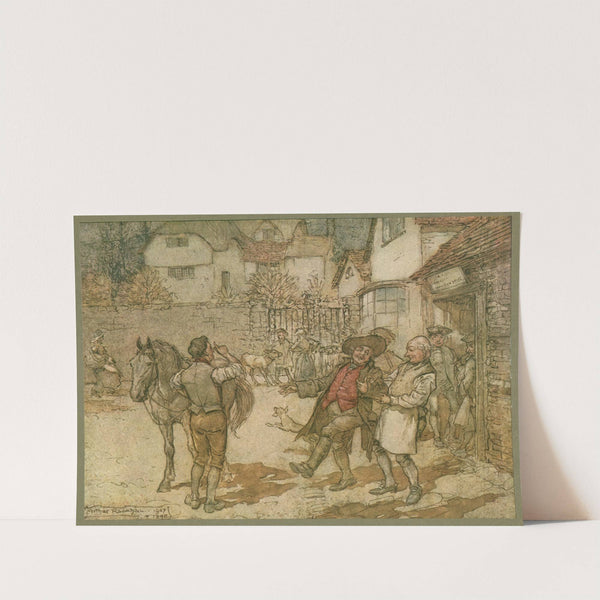 This charming print depicts a quaint rural scene rendered in a soft, earthy palette with delicate washes of color. The artwork captures a moment from everyday village life, where a man dressed in 18th-century attire—complete with a red vest and...