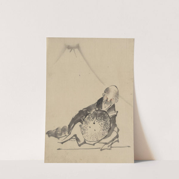 A monk reclining, holding a large conical hat in front of him, with view of Mount Fuji in the background by Katsushika Hokusai - Wall Art Print