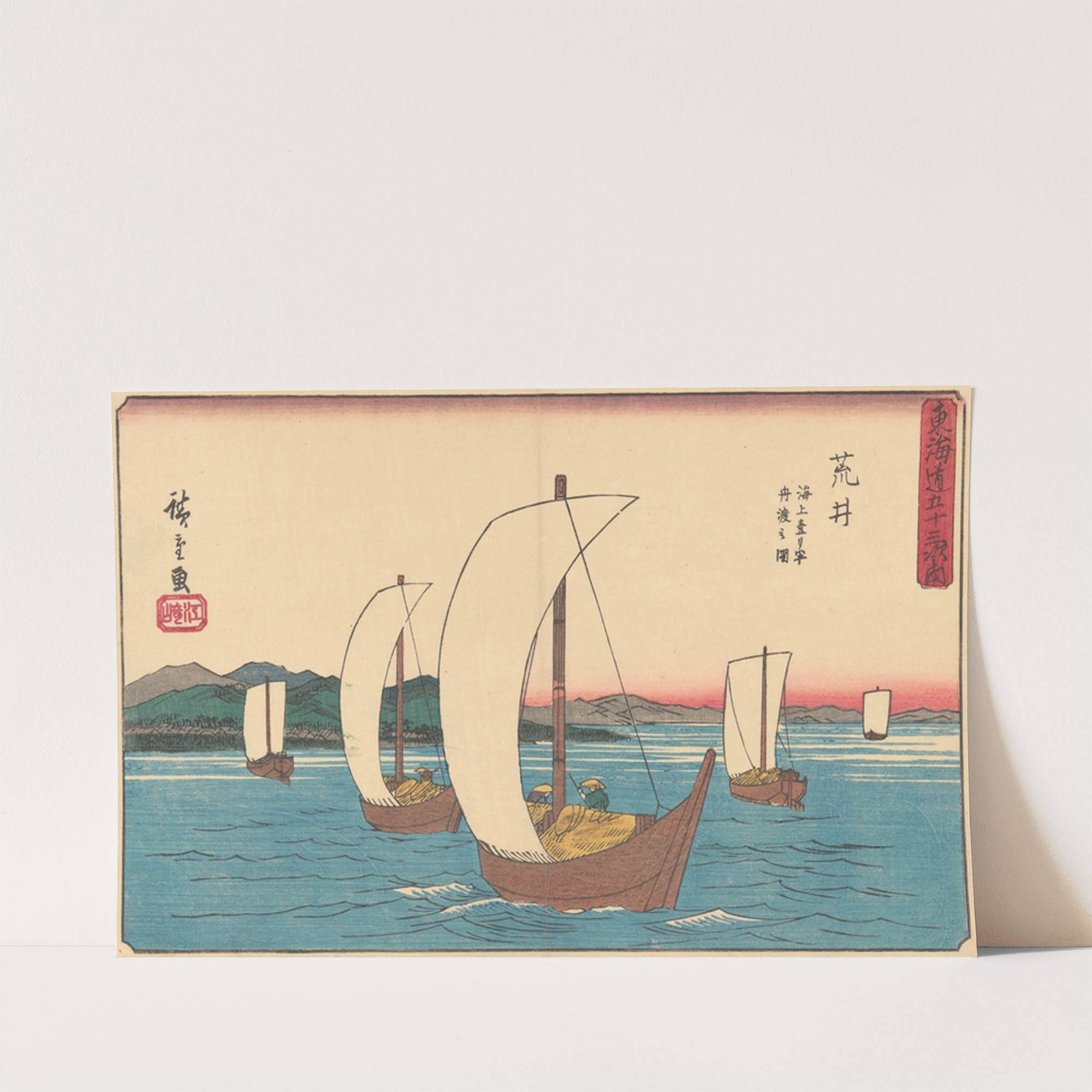 This vibrant print features a classic ukiyo-e style illustration by the renowned artist Andō Hiroshige. The scene depicts traditional Japanese sailing vessels navigating calm, blue waters under a serene sky transitioning from soft pink to gentle yellow hues as the...
