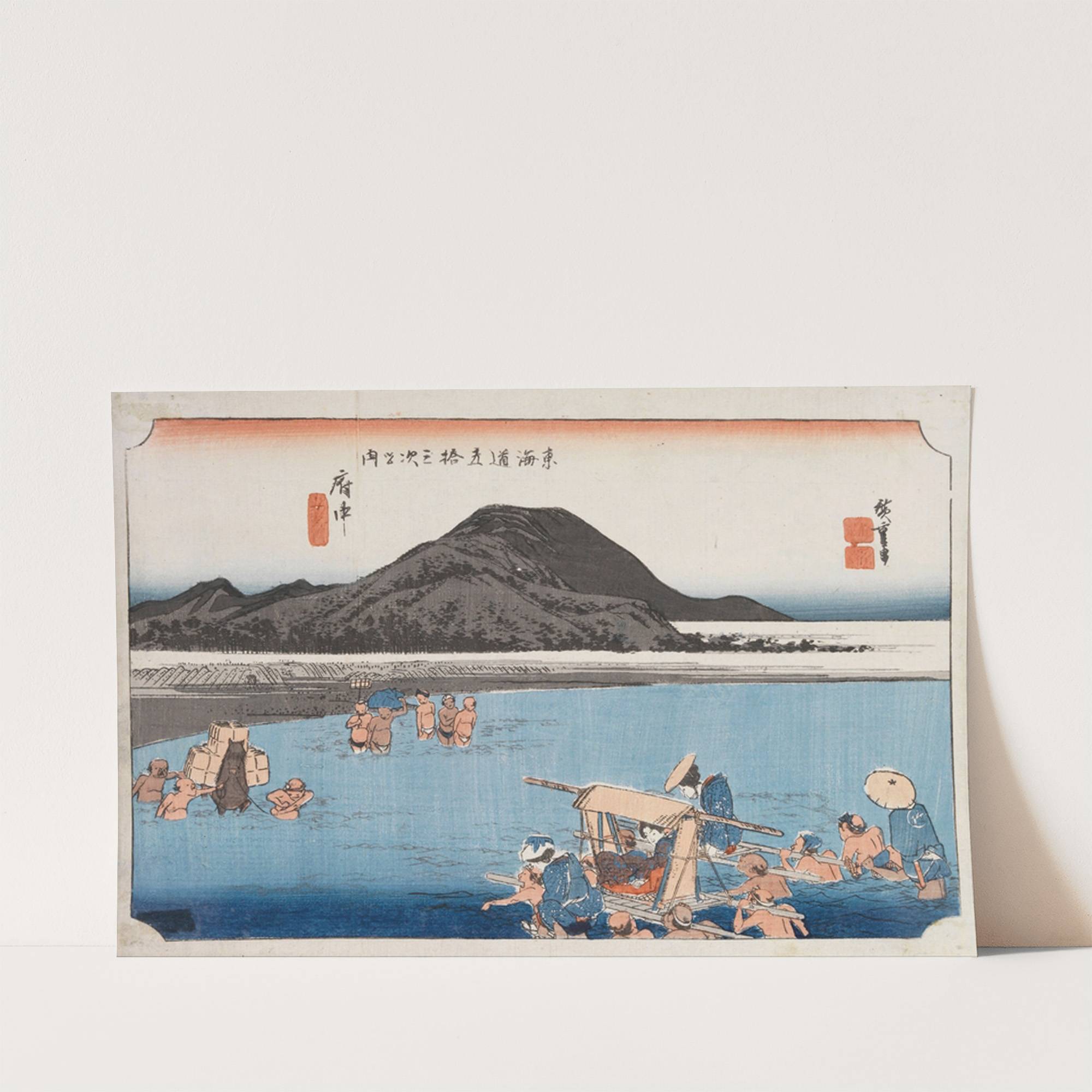 This vibrant art print features "Fuchū" by renowned Japanese artist Andō Hiroshige. The piece captures a lively scene set against the backdrop of a large, dark mountainous landscape under a soft gradient sky transitioning from white to faint red hues.In...
