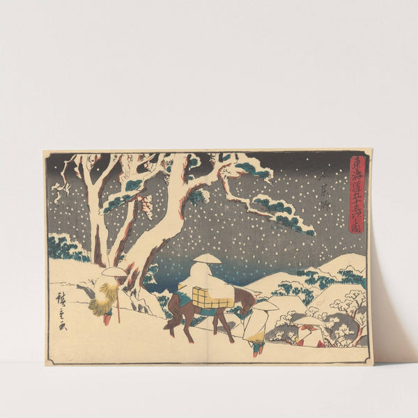 This vibrant print features "Ishiyakushi" by the renowned Japanese artist Andō Hiroshige. The scene showcases a serene winter landscape with deep blue snow-covered hills and a star-filled night sky, rendered in bold, contrasting colors. A large, leafless tree dominates the...