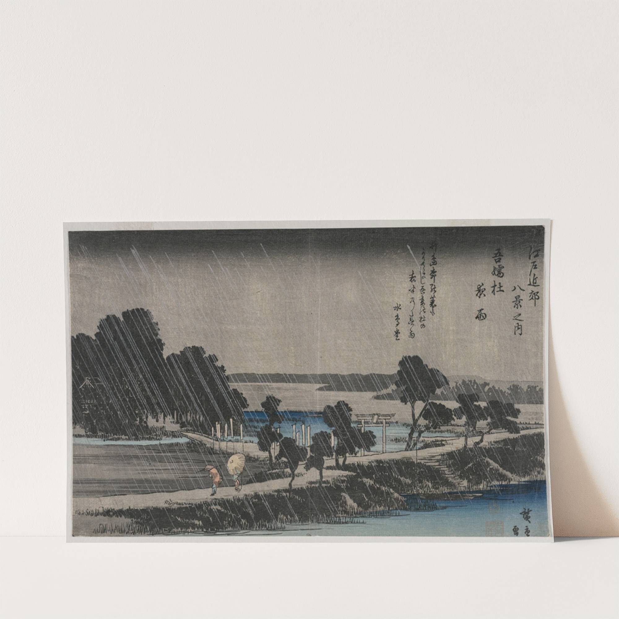 Experience the serene beauty of 19th-century Japanese art with this stunning ukiyo-e print titled "Night Rain at the Azuma Shrine" by Andō Hiroshige. This elegant piece features a tranquil rural landscape under the gentle patter of raindrops, expertly captured in...