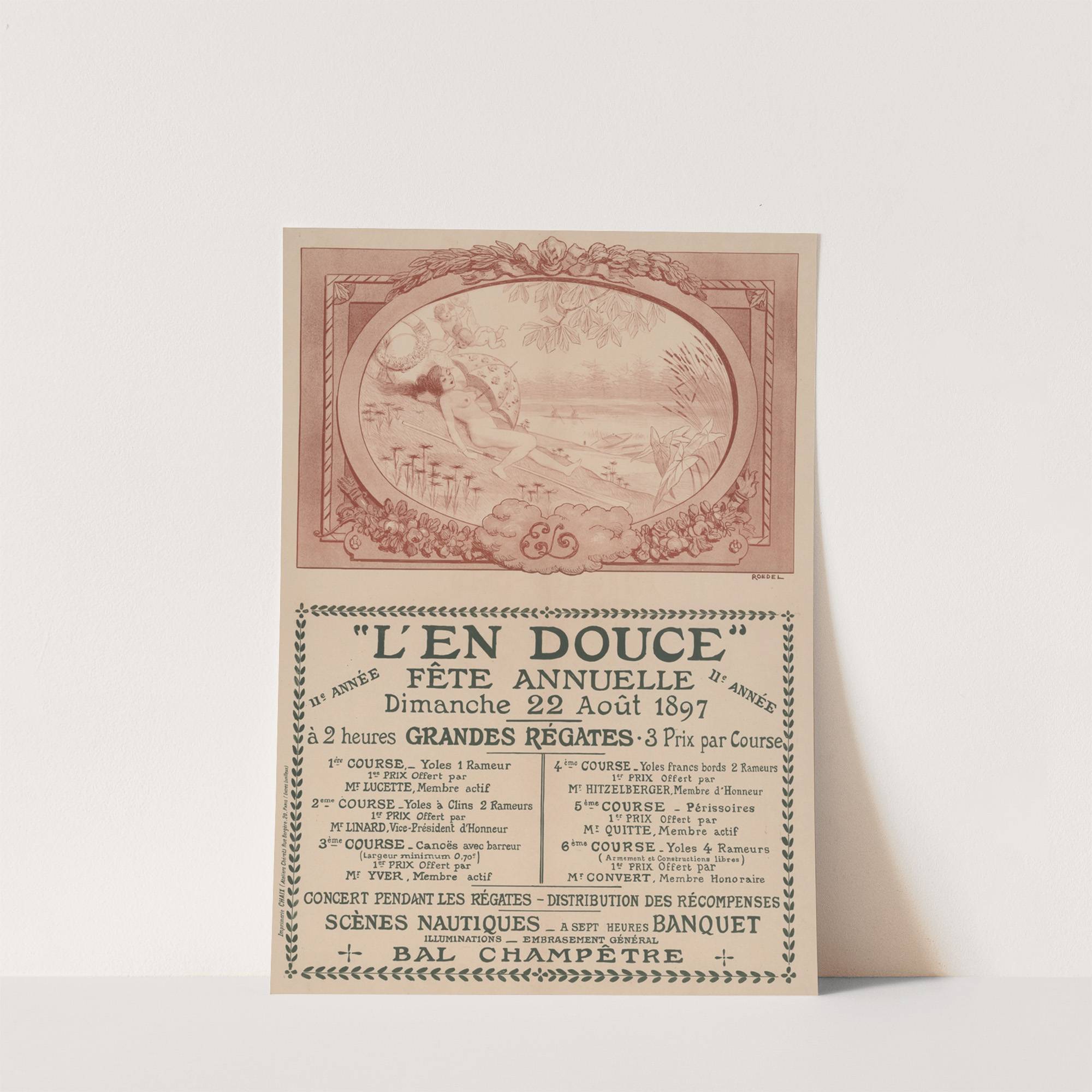 L’ En Douce, fête annuelle, 11e année – Dimanche 22 août 1897. Grandes régates. concert pendant les régates (1897) by Auguste Roedel - Wall Art Print
