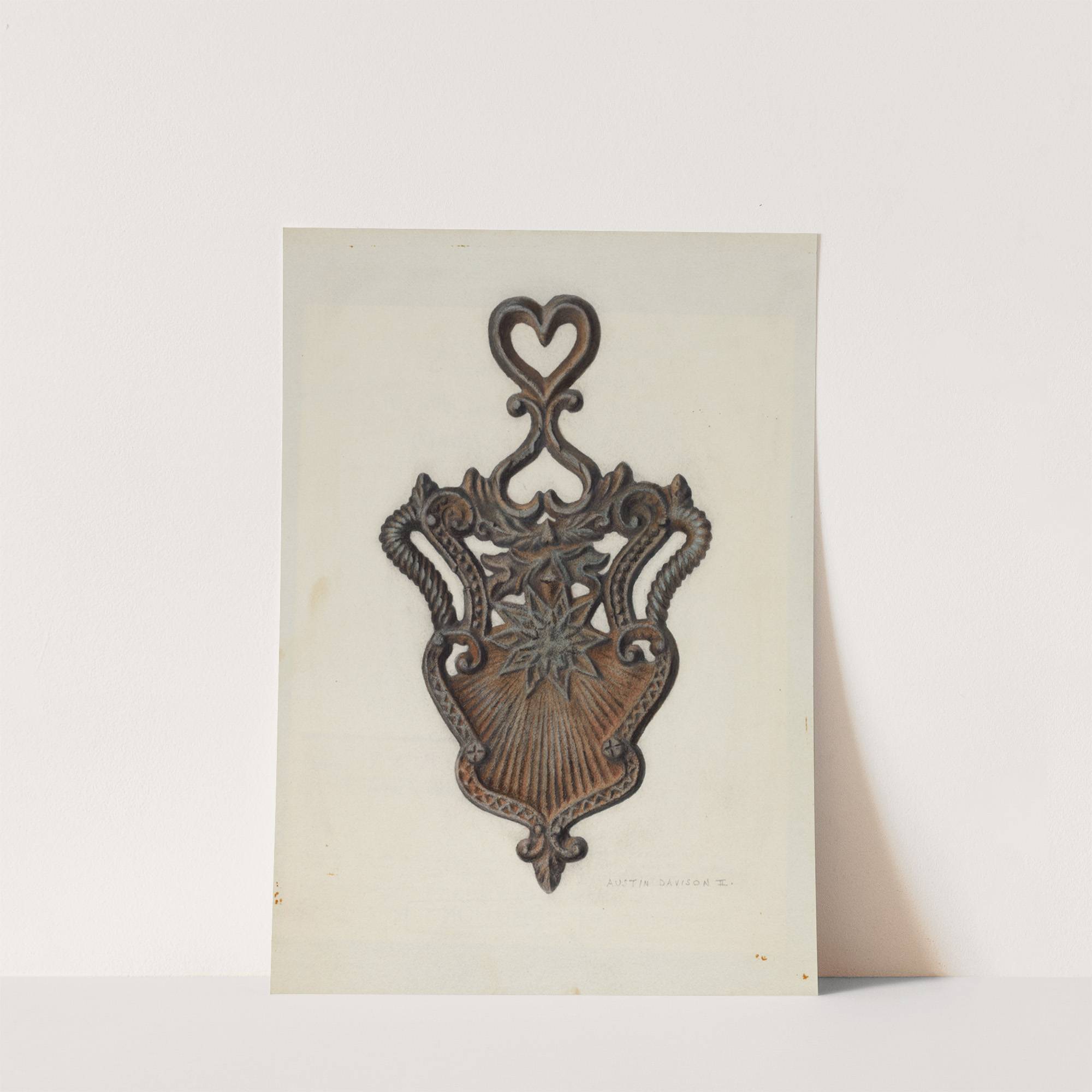 This striking art print features "Cast Iron Stand" by Austin L. Davison, showcasing an intricate and elegant design. The centerpiece of the artwork is an ornate iron stand, meticulously detailed with swirling patterns and decorative elements. At its heart, a...