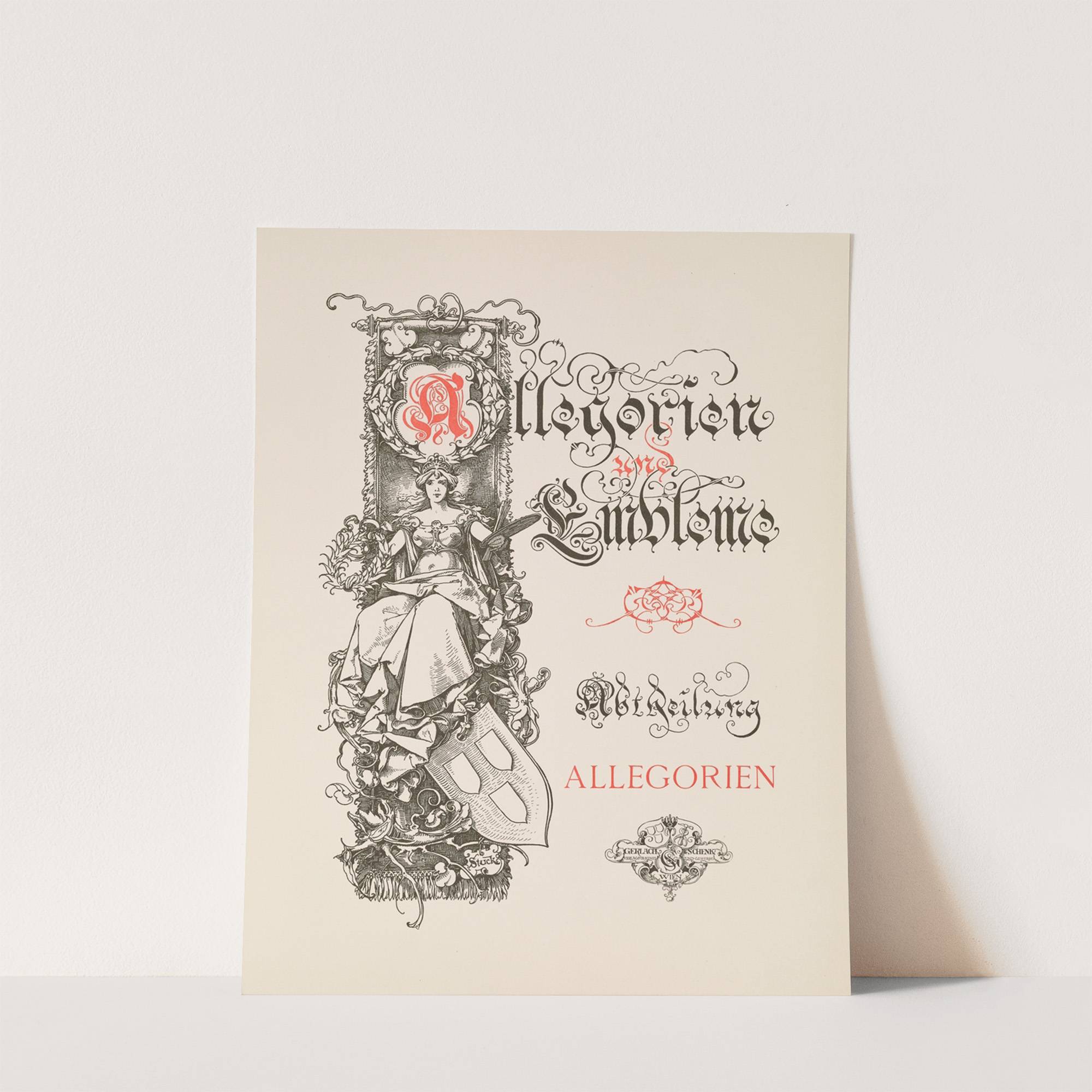 This artwork is "Allegorie und Emblème" by artist Albert Ilg, showcasing a meticulously detailed monochromatic illustration with striking red accents. At the center stands an elegant, crowned female figure adorned in intricate baroque-style clothing that features flowing robes and delicate...