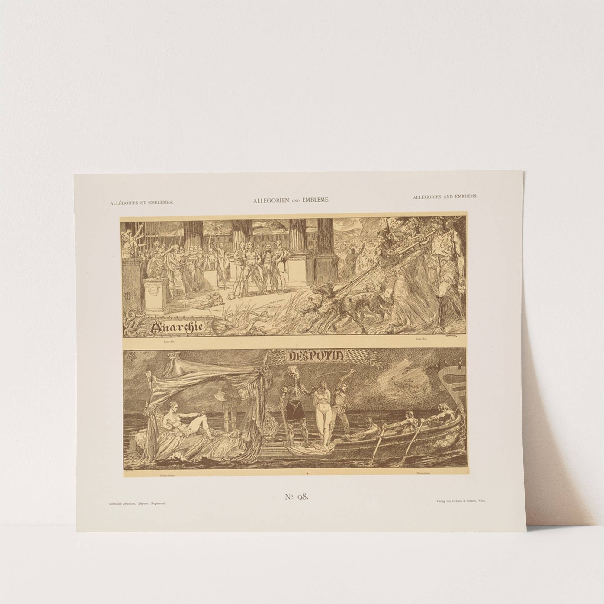 This artwork features two detailed engravings from "Allegorie und Embleme Vol. I Plate 116" by Albert Ilg. The top panel depicts an allegory of Justice, with a central figure holding scales in her right hand and a sword in her...