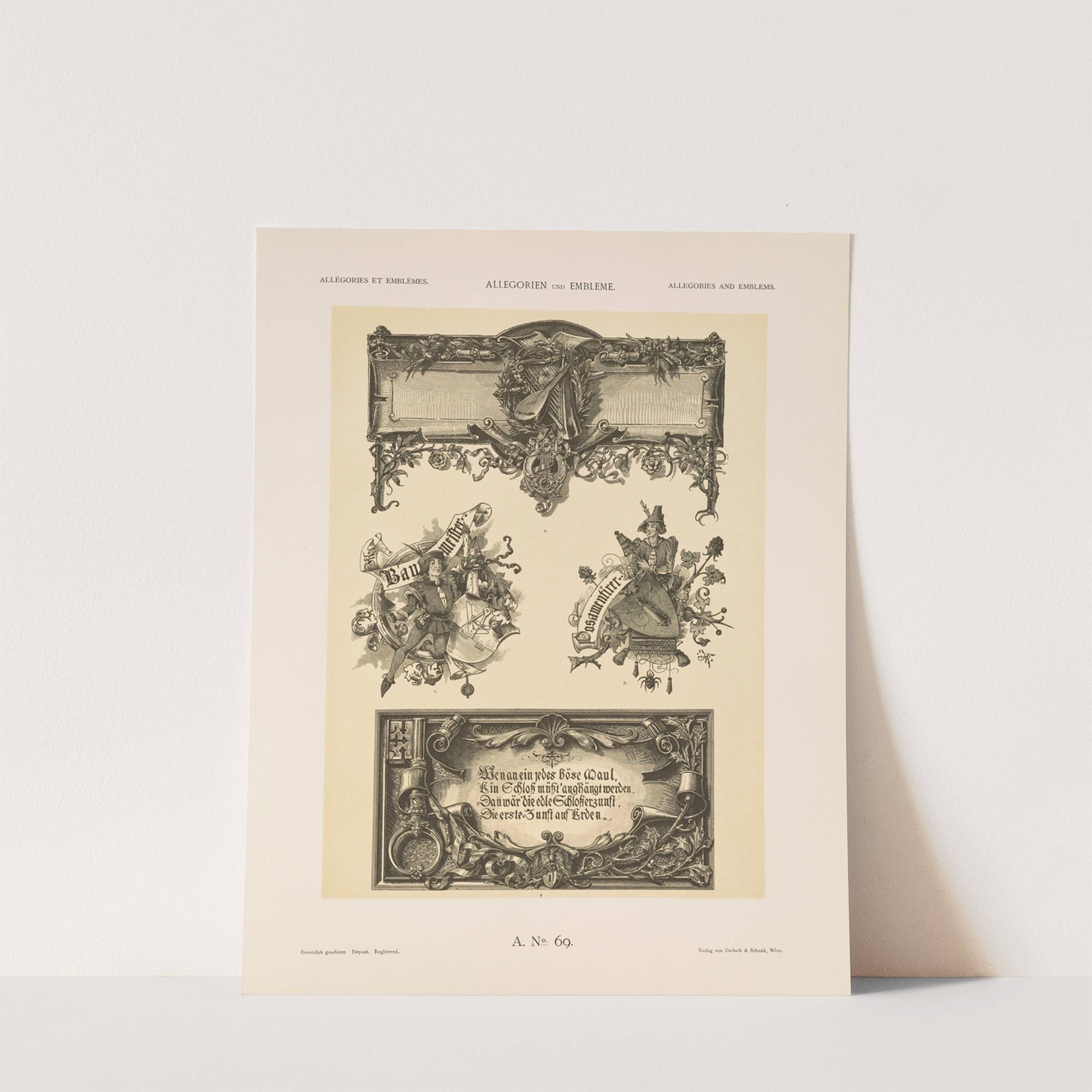 This elegant art print features "Allegorische und Embleme Vol. II Pl.079" by the renowned artist Albert Ilg. The piece is meticulously detailed in black and white, showcasing a rich Baroque-inspired design. At the top of the page, an intricately carved...