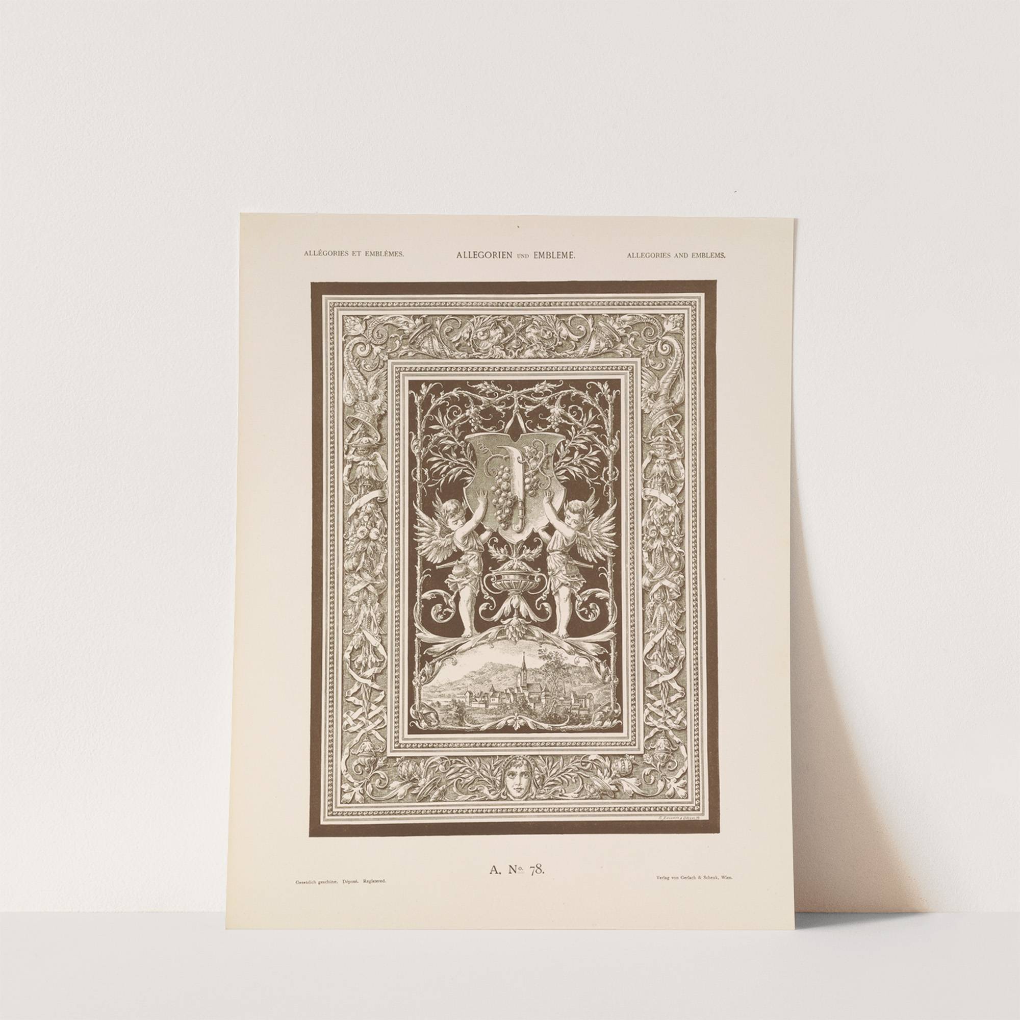 This exquisite print features "Allegorie von Mercurius," an intricate piece from Albert Ilg's series. The artwork is characterized by its rich, detailed relief-style engraving in a classic, monochromatic brown and white palette. At the center of the composition, two majestic,...