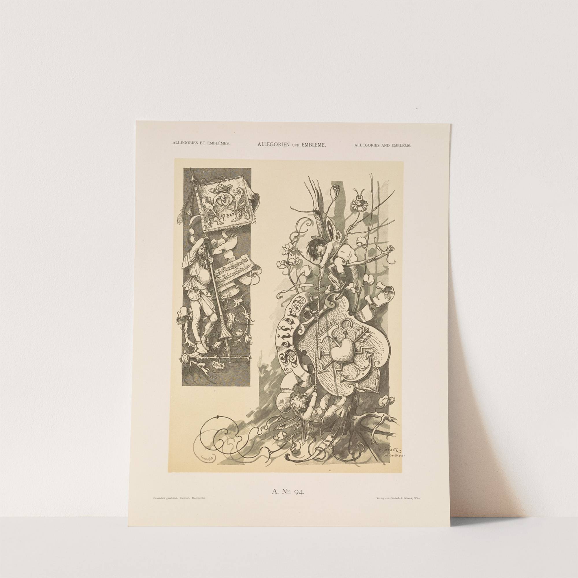 This art print features an intricate monochromatic illustration from "Allegorien und Emblème" Volume II, Plate 104, created by the renowned artist Albert Ilg. The composition is a detailed and imaginative blend of both classical and modern elements, rendered in a...