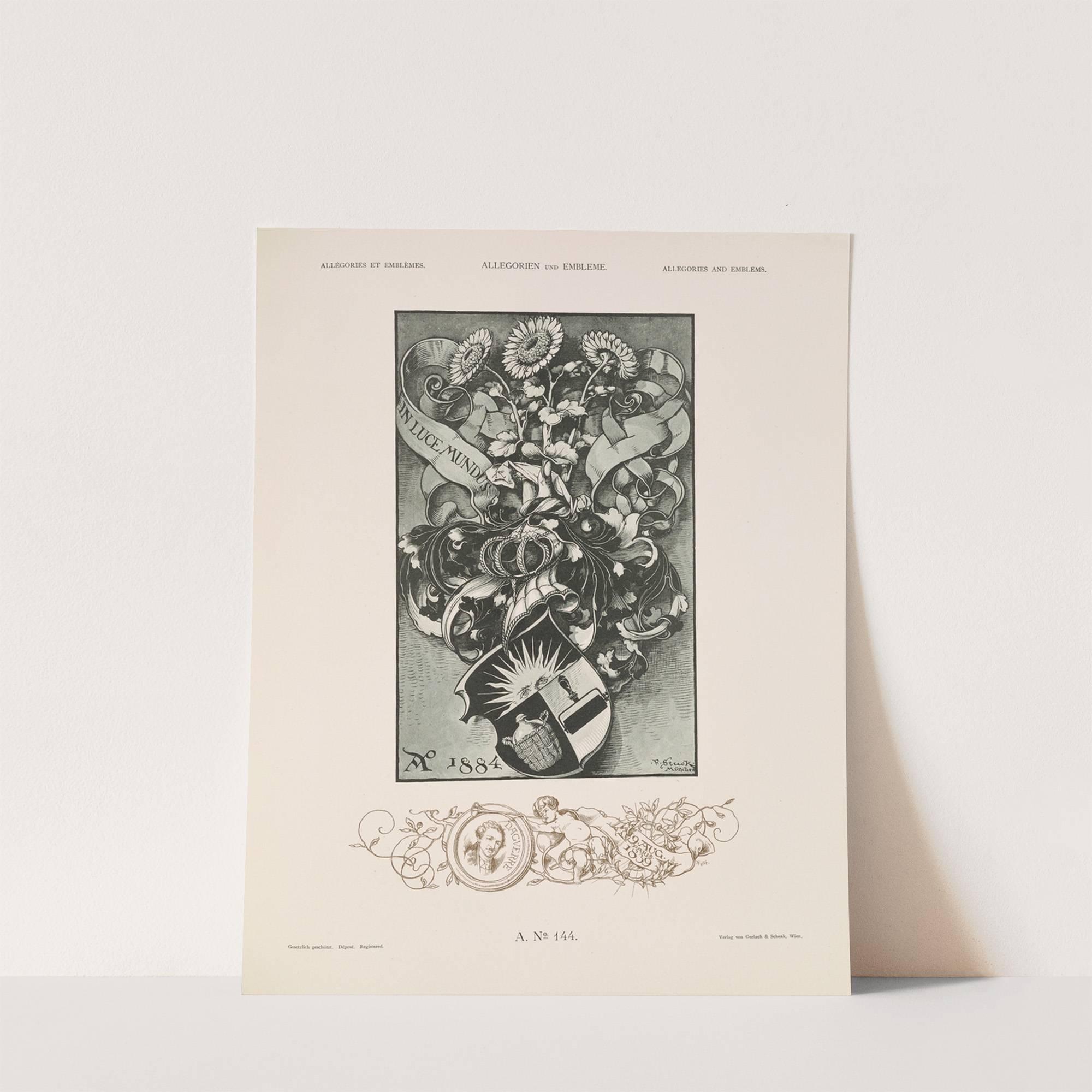 This artwork is "Allegorie und Embleme Vol. II Pl.155" by the renowned artist Albert Ilg. The piece features intricate black and white line art with a strong emphasis on detailed patterns and floral motifs. At the center of the image,...